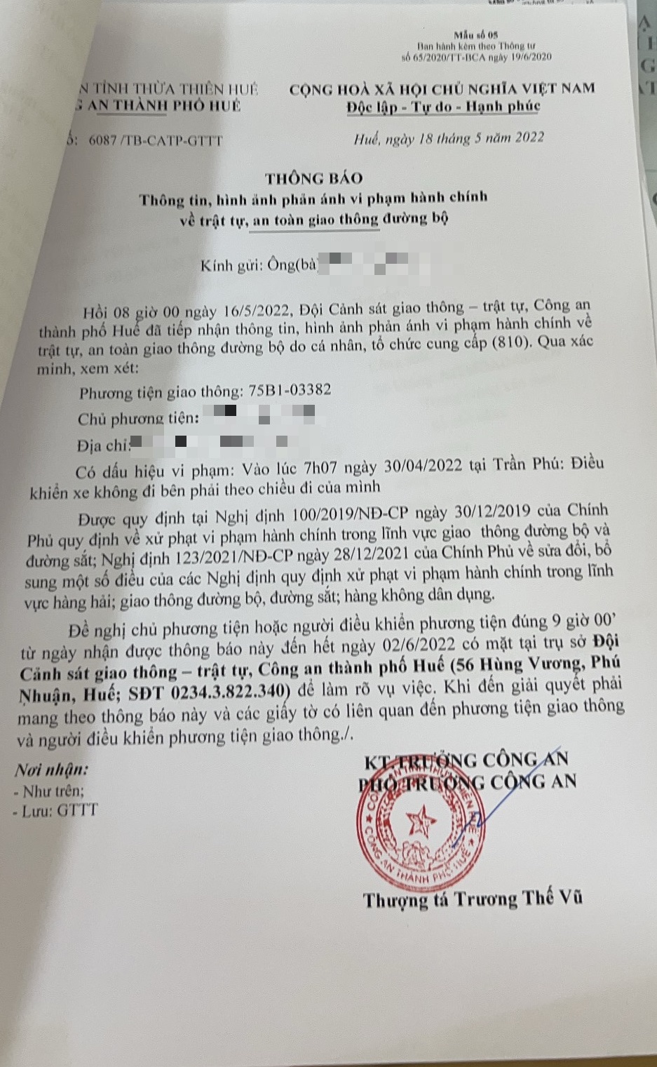Công an thành phố đã lập hồ sơ, thông báo chủ phương tiện đến làm việc vào ngày 02/6/2022. Tuy nhiên, hiện chủ phương tiện vẫn chưa trình diện tại cơ quan. Công an thành phố Huế sẽ tiếp tục thông báo lực lượng tuần tra trên địa bàn, trong quá trình làm nhiệm vụ phát hiện, xử lý.