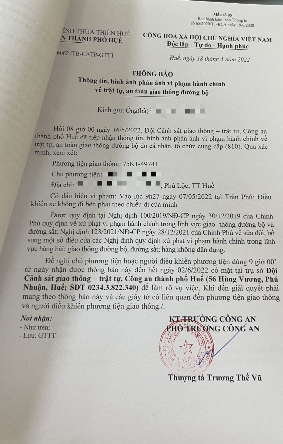 Công an thành phố đã lập hồ sơ, thông báo chủ phương tiện đến làm việc vào ngày 02/6/2022. Tuy nhiên, hiện chủ phương tiện vẫn chưa trình diện tại cơ quan. Công an thành phố Huế sẽ tiếp tục thông báo lực lượng tuần tra trên địa bàn, trong quá trình làm nhiệm vụ phát hiện, xử lý.