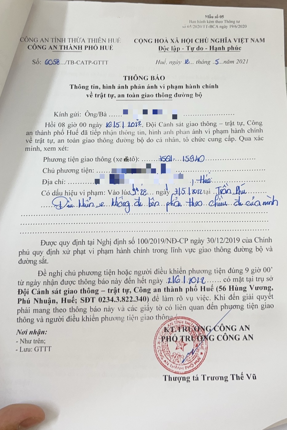Công an thành phố đã lập hồ sơ, thông báo chủ phương tiện đến làm việc vào ngày 02/6/2022. Tuy nhiên, hiện chủ phương tiện vẫn chưa trình diện tại cơ quan. Công an thành phố Huế sẽ tiếp tục thông báo lực lượng tuần tra trên địa bàn, trong quá trình làm nhiệm vụ phát hiện, xử lý.