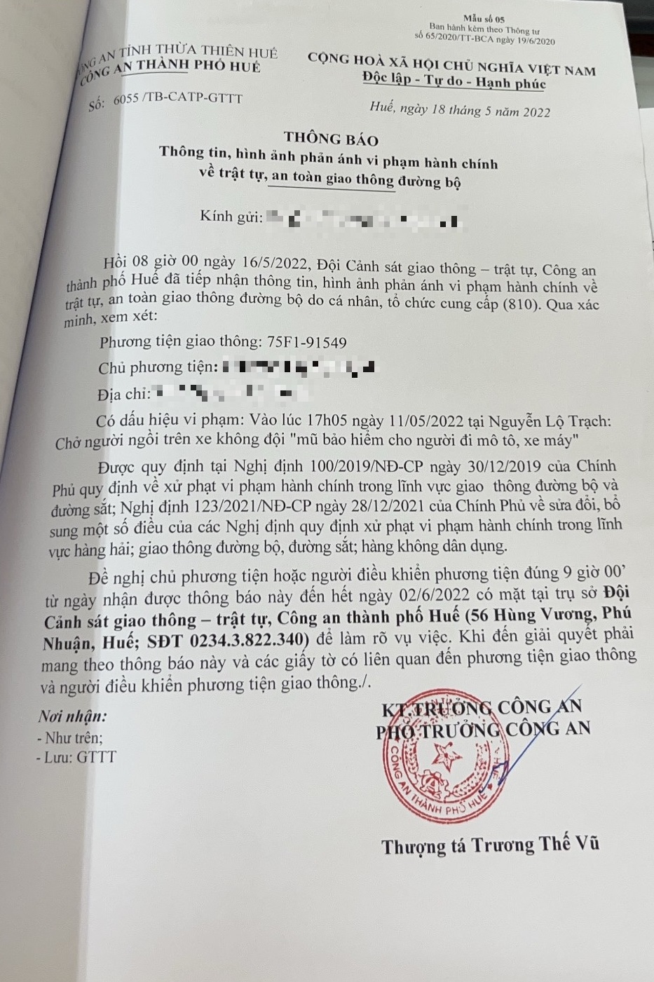 Công an thành phố đã lập hồ sơ, thông báo chủ phương tiện đến làm việc. Tuy nhiên, hiện chủ phương tiện vẫn chưa trình diện tại cơ quan. Công an thành phố Huế sẽ tiếp tục thông báo lực lượng tuần tra trên địa bàn, trong quá trình làm nhiệm vụ phát hiện, xử lý.