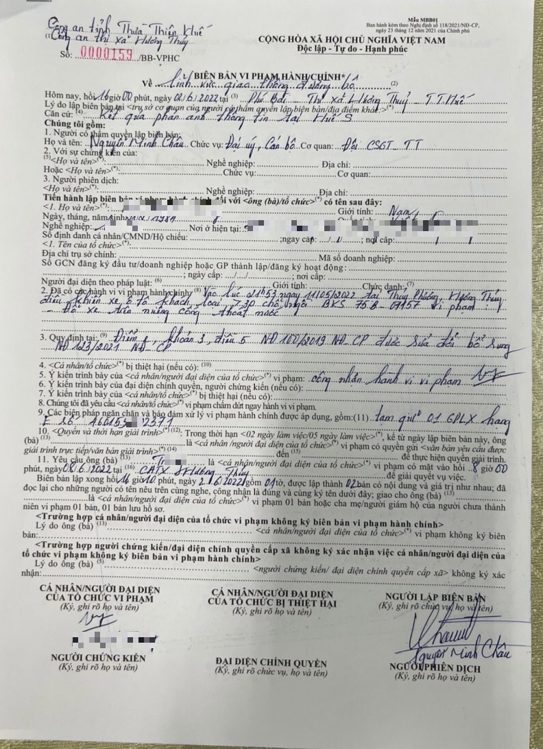 Tại cơ quan, chủ phương tiện 75B01157 đã xem hình ảnh, công nhận vi phạm lỗi: Đỗ xe trên miệng cống thoát nước (quy định tại điểm e, Khoản 3, Điều 5 Nghị định 100/2019/NĐ-CP; sửa đổi, bổ sung tại Nghị định 123/2021/NĐ-CP), đồng thời cam kết không tái phạm. Công an Thị xã Hương Thủy đã lập biên bản vi phạm hành chính, ra quyết định xử phạt đối với chủ phương tiện về lỗi trên, phạt tiền 900.000 đồng. (Quyết định xử phạt sẽ được cập nhật sau khi hoàn tất thủ tục).
