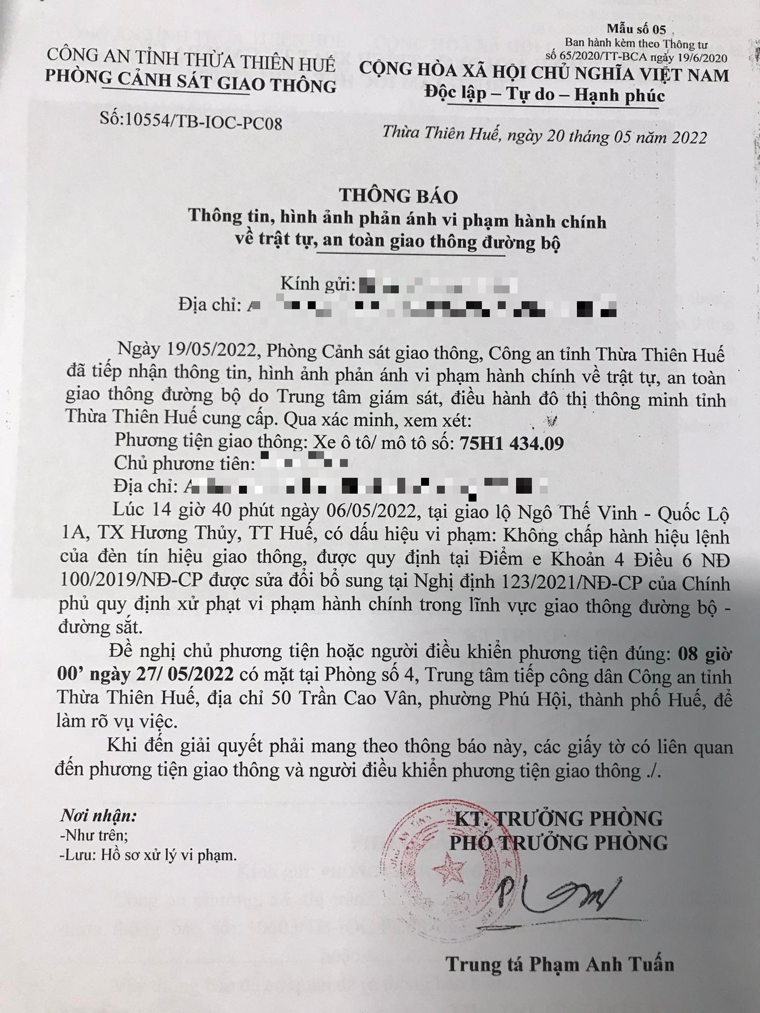 Vào lúc 14 giờ 40 phút ngày 06/05/2022, mô tô mang biển kiểm soát 75H143409 không chấp hành hiệu lệnh của đèn tín hiệu giao thông tại giao lộ Quốc Lộ 1A - Ngô Thế Vinh.