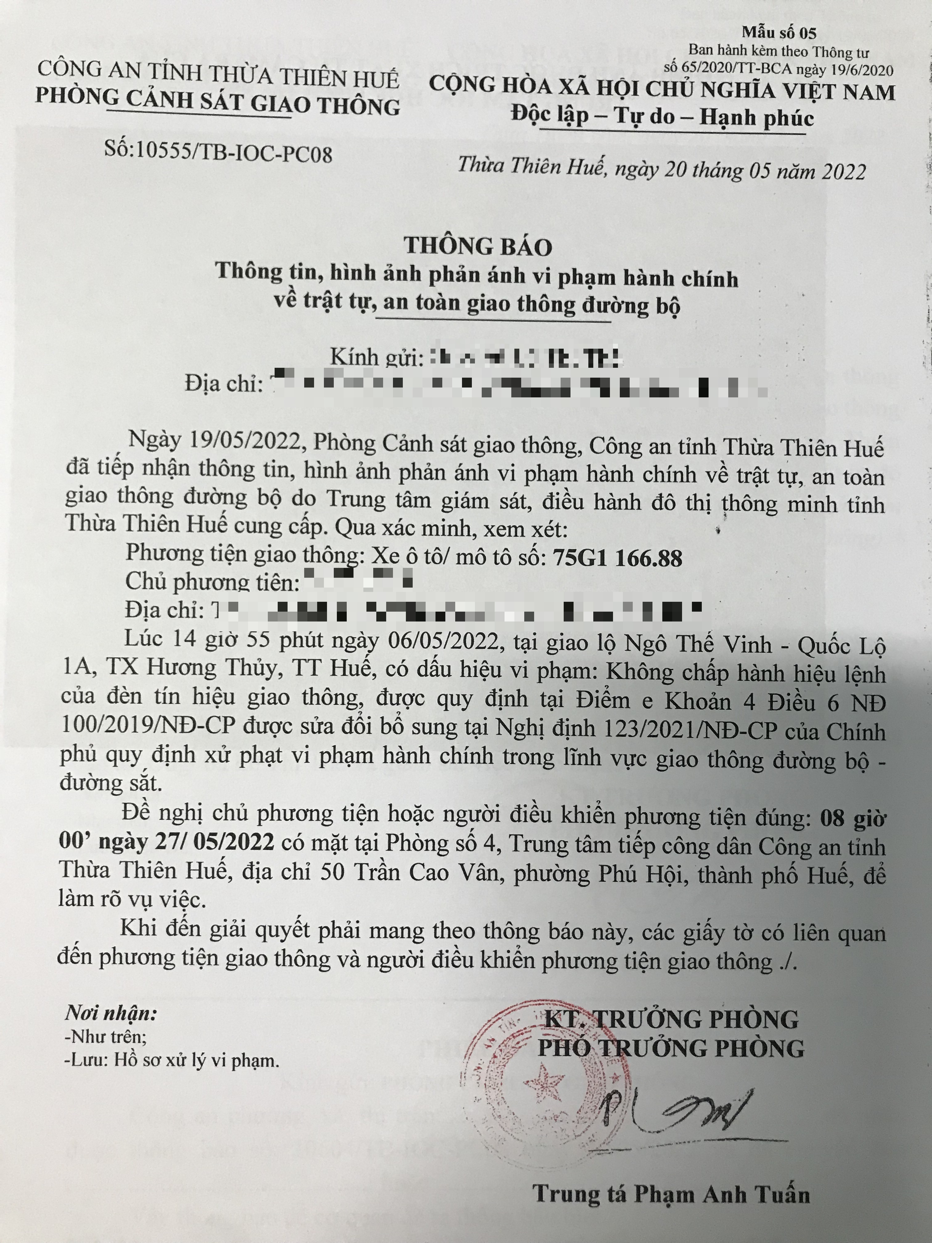 Vào lúc 14 giờ 55 phút ngày 06/05/2022, mô tô mang biển kiểm soát 75G116688 không chấp hành hiệu lệnh của đèn tín hiệu giao thông tại giao lộ Quốc Lộ 1A - Ngô Thế Vinh.