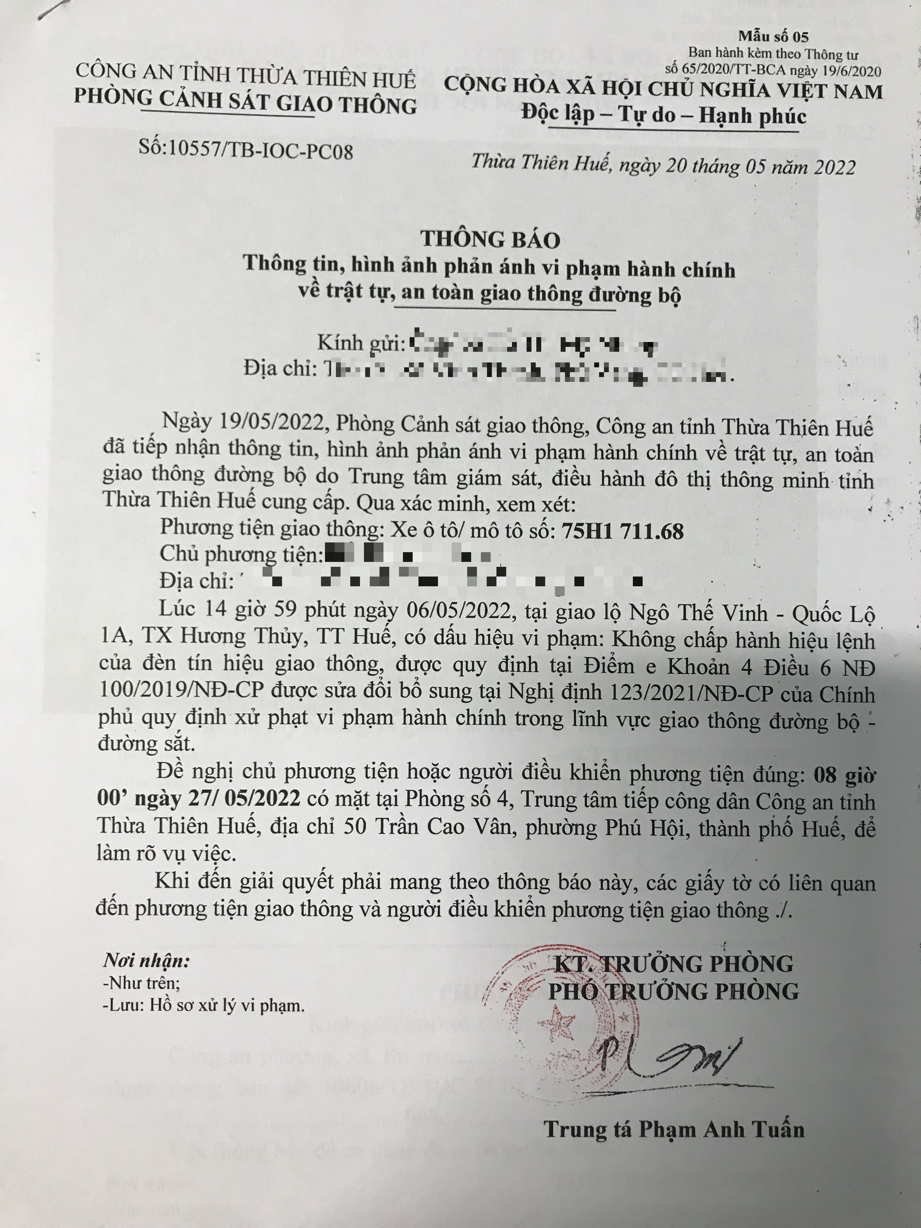 Vào lúc 14 giờ 59 phút ngày 06/05/2022, mô tô mang biển kiểm soát 75H171168 không chấp hành hiệu lệnh của đèn tín hiệu giao thông tại giao lộ Quốc Lộ 1A - Ngô Thế Vinh.