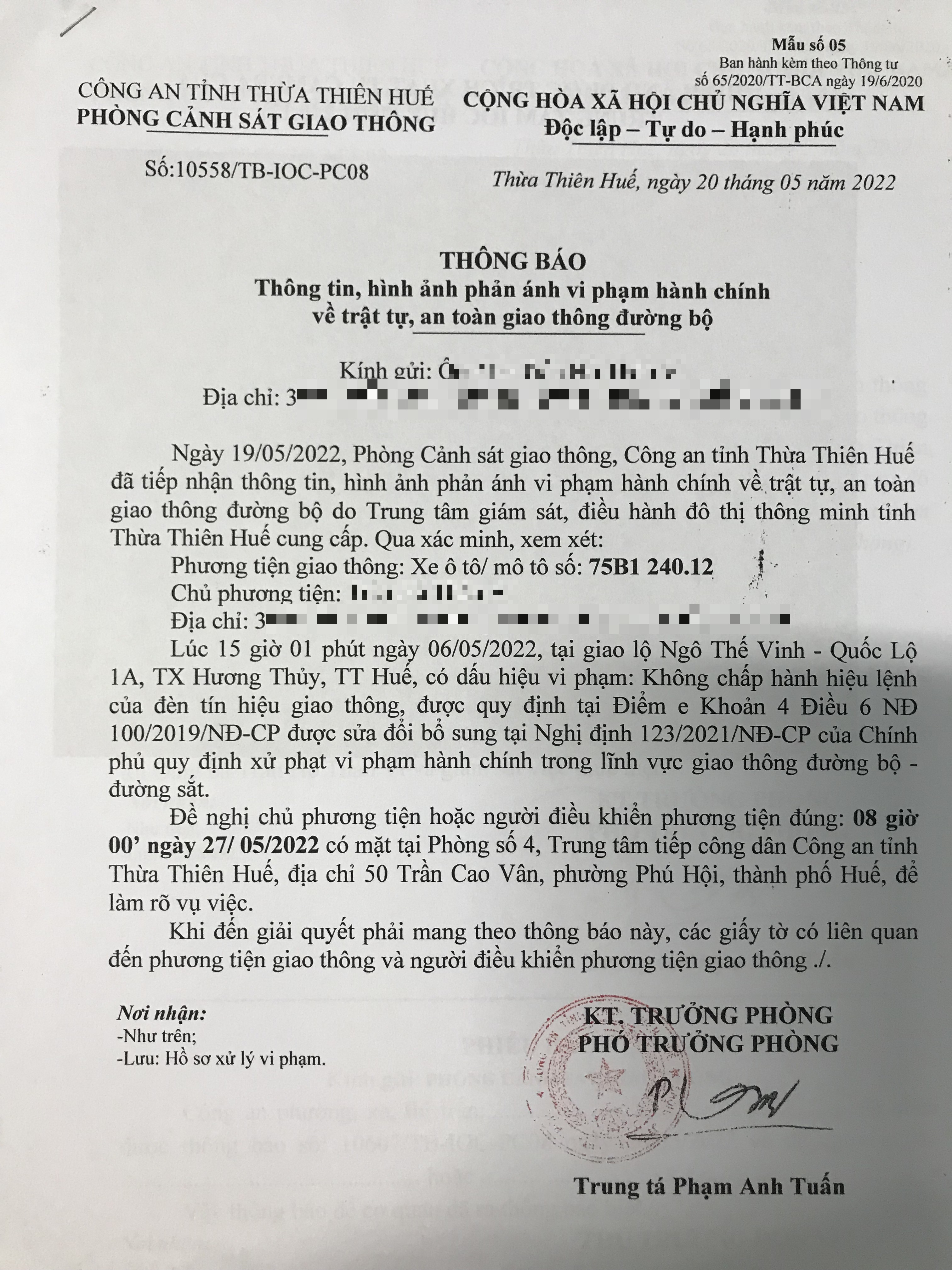 Vào lúc 15 giờ 01 phút ngày 06/05/2022, mô tô mang biển kiểm soát 75B124012 không chấp hành hiệu lệnh của đèn tín hiệu giao thông tại giao lộ Quốc Lộ 1A - Ngô Thế Vinh.