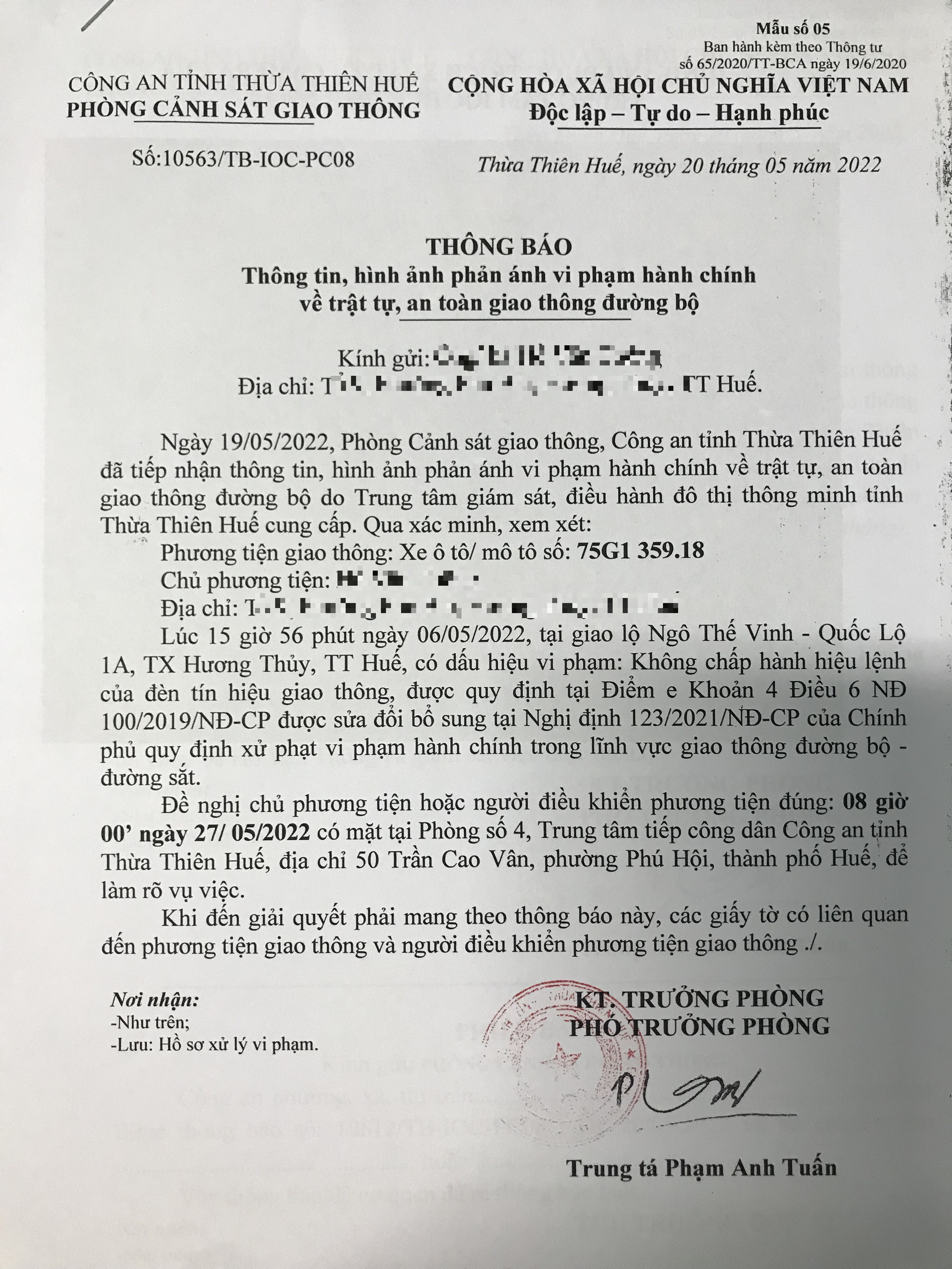 Vào lúc 15 giờ 56 phút ngày 06/05/2022, mô tô mang biển kiểm soát 75G135918 không chấp hành hiệu lệnh của đèn tín hiệu giao thông tại giao lộ Quốc Lộ 1A - Ngô Thế Vinh.