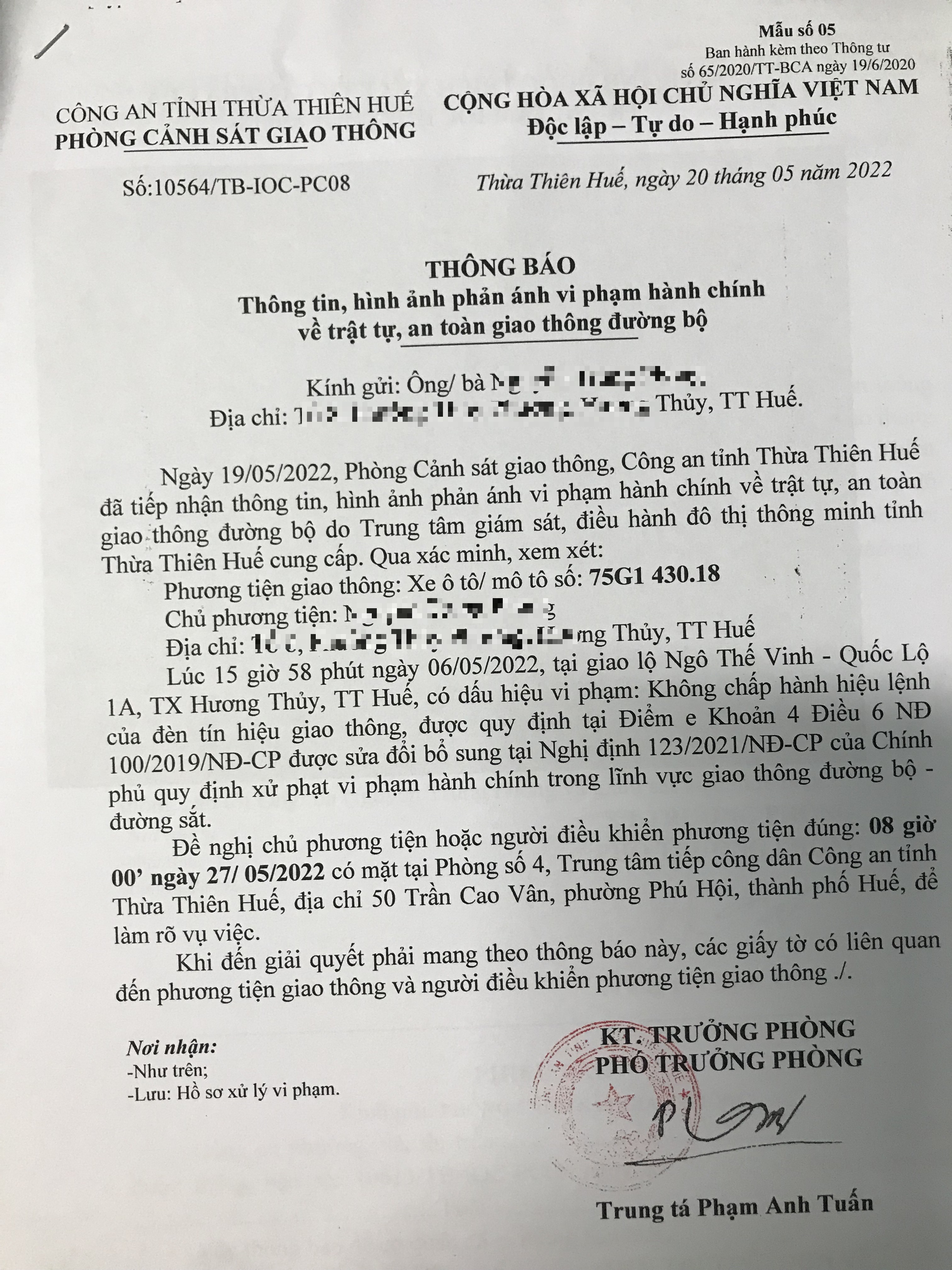 Vào lúc 15 giờ 58 phút ngày 06/05/2022, mô tô mang biển kiểm soát 75G143018 không chấp hành hiệu lệnh của đèn tín hiệu giao thông tại giao lộ Quốc Lộ 1A - Ngô Thế Vinh.