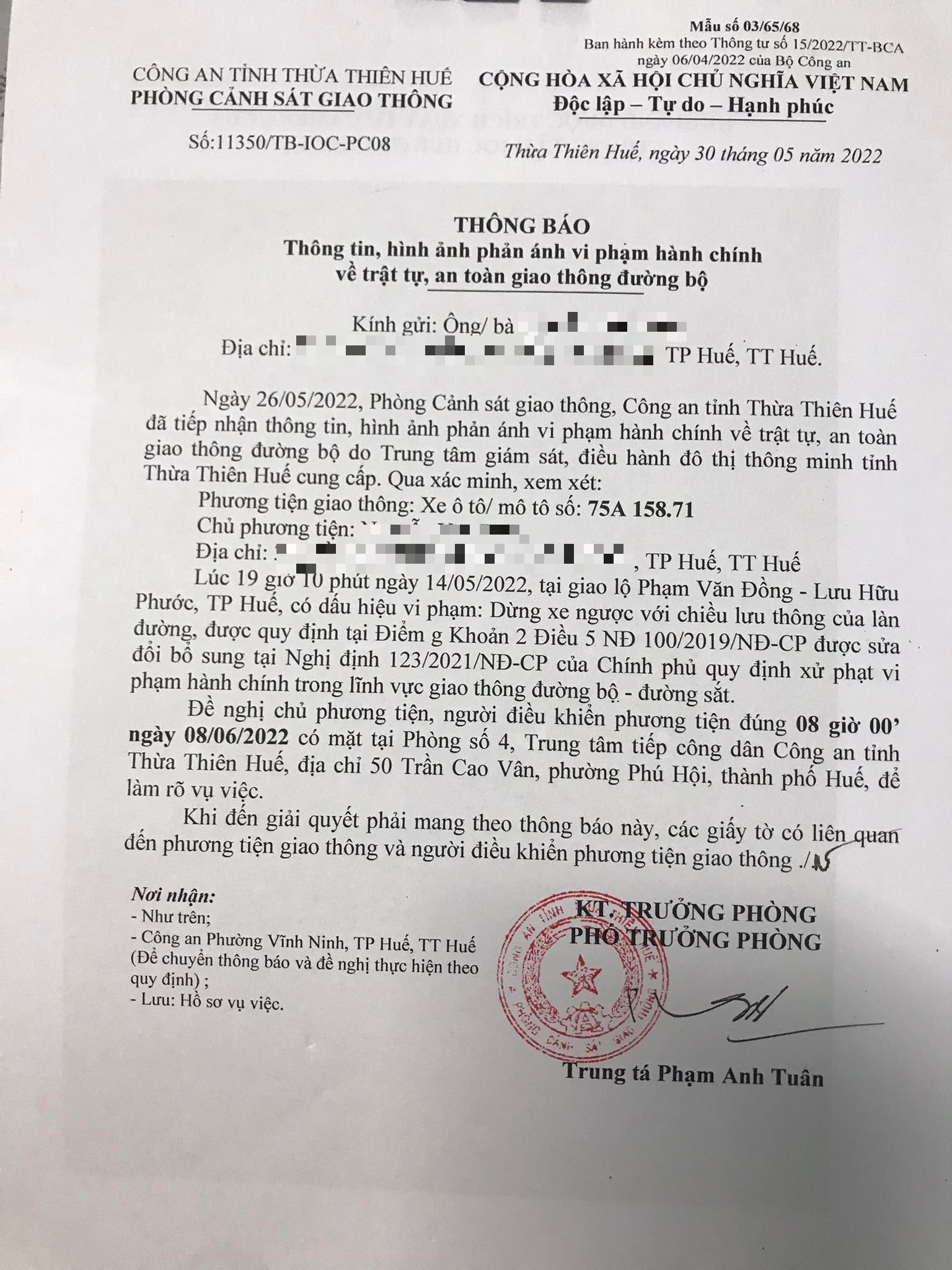 Phòng Cảnh sát giao thông đã lập hồ sơ, thông báo chủ phương tiện làm việc vào ngày 08/6/2022. Tuy nhiên, hiện chủ phương tiện vẫn chưa trình diện tại cơ quan. Phòng Cảnh sát giao thông sẽ gửi thông báo cho cơ quan đăng kiểm để đưa phương tiện vào cảnh báo trên Chương trình Quản lý kiểm định.