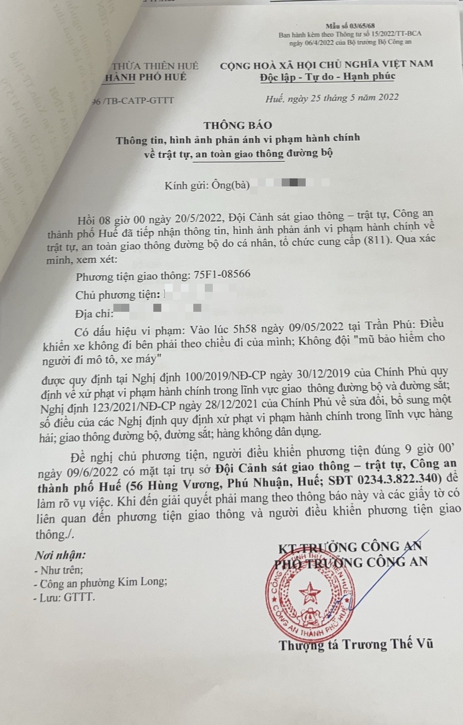 Công an thành phố đã lập hồ sơ, thông báo chủ phương tiện đến làm việc vào ngày 09/6/2022. Tuy nhiên, hiện chủ phương tiện vẫn chưa trình diện tại cơ quan. Công an thành phố Huế sẽ tiếp tục thông báo lực lượng tuần tra trên địa bàn, trong quá trình làm nhiệm vụ phát hiện, xử lý.