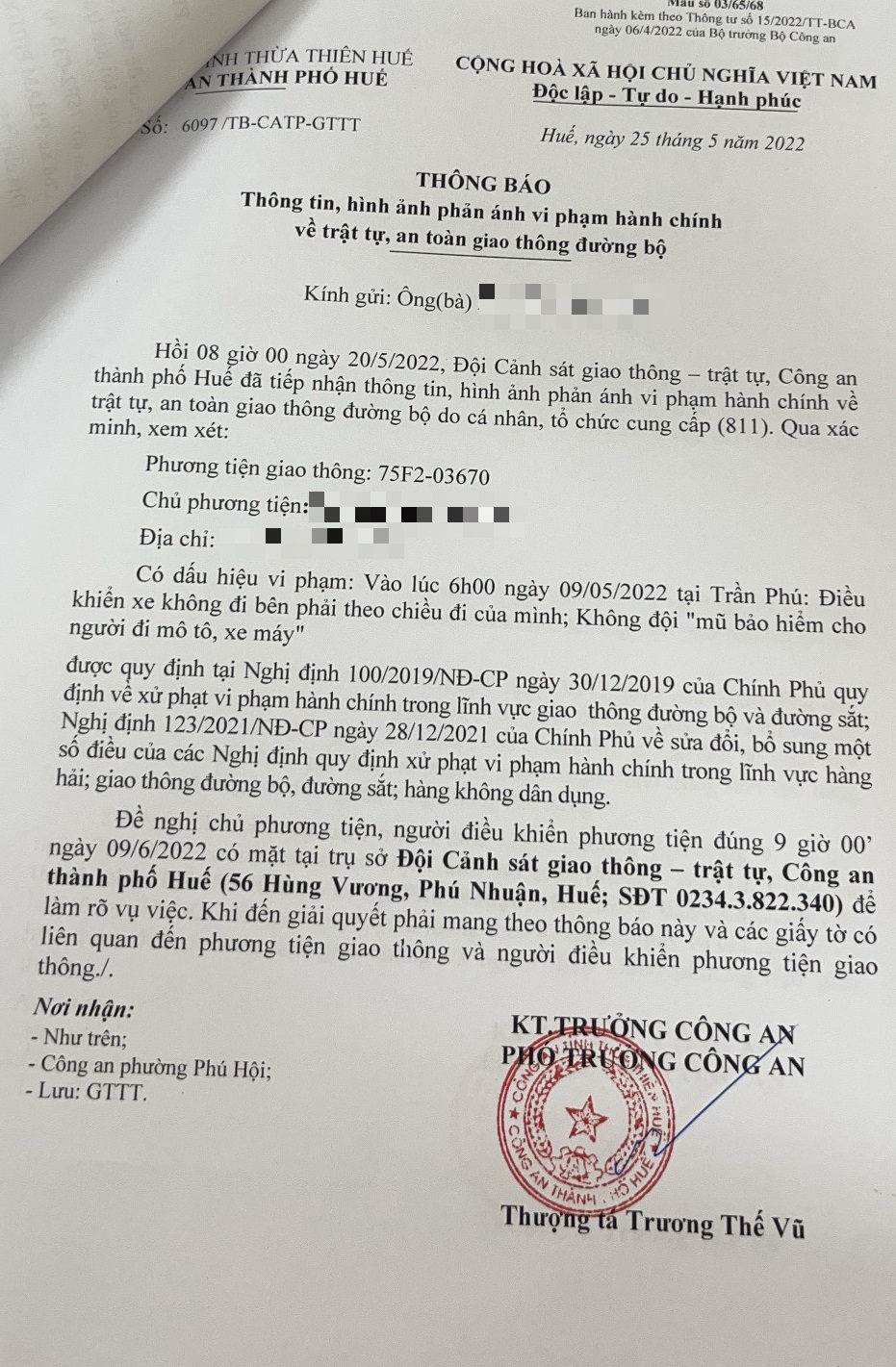 Công an thành phố đã lập hồ sơ, thông báo chủ phương tiện đến làm việc vào ngày 09/6/2022. Tuy nhiên, địa chỉ đăng ký trên cơ sở dữ liệu không đúng với địa chỉ thực sự của chủ phương tiện. Do đó, Công an thành phố Huế sẽ tiếp tục thông báo lực lượng tuần tra trên địa bàn, trong quá trình làm nhiệm vụ phát hiện, xử lý.