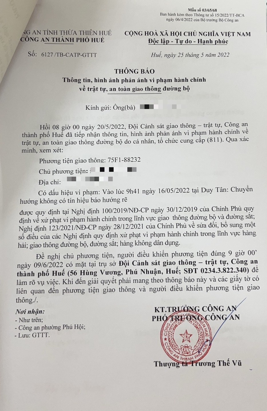 Công an thành phố đã lập hồ sơ, thông báo chủ phương tiện đến làm việc vào ngày 09/6/2022. Tuy nhiên, hiện chủ phương tiện vẫn chưa trình diện tại cơ quan. Công an thành phố Huế sẽ tiếp tục thông báo lực lượng tuần tra trên địa bàn, trong quá trình làm nhiệm vụ phát hiện, xử lý.