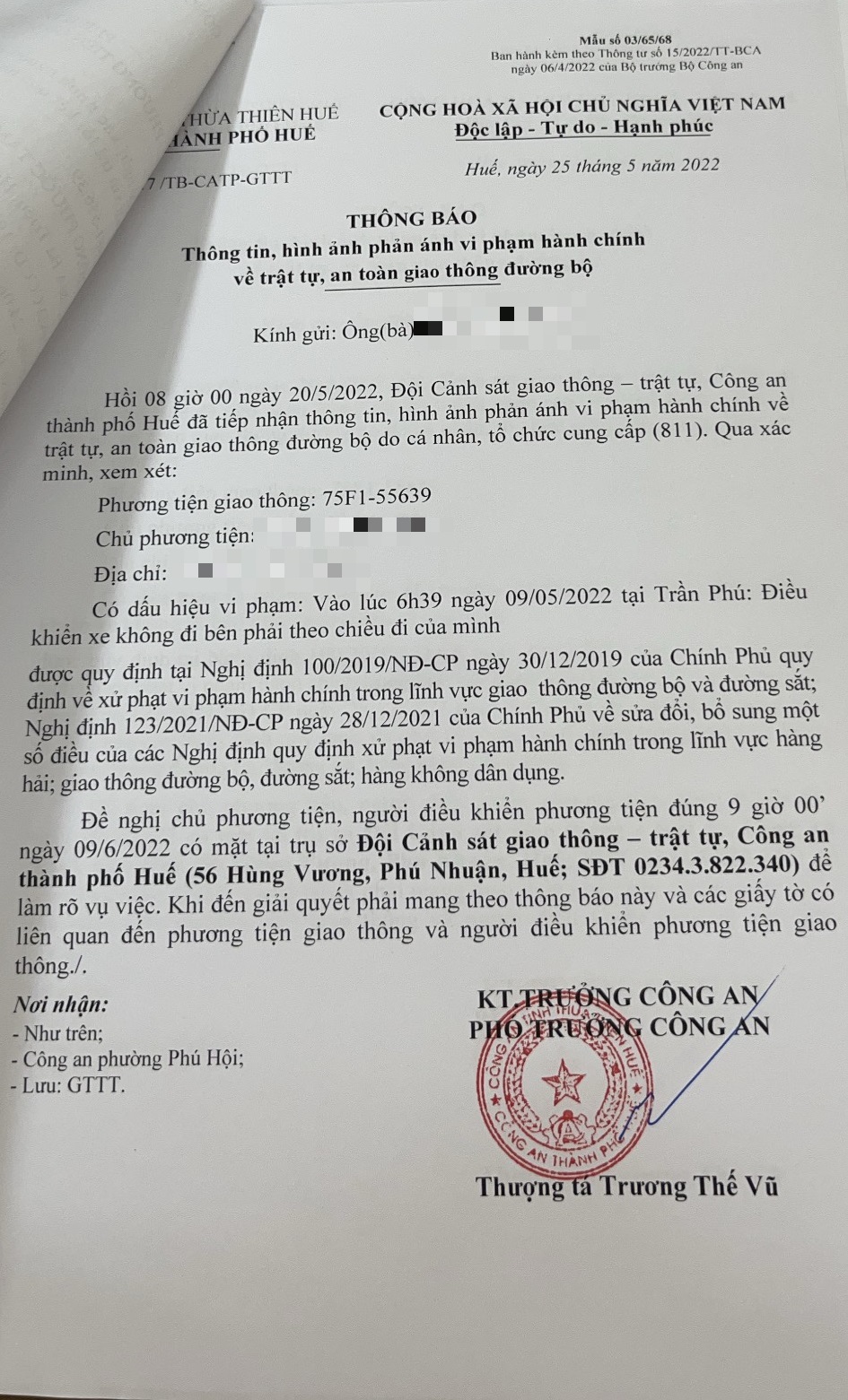Công an thành phố đã lập hồ sơ, thông báo chủ phương tiện đến làm việc vào ngày 09/6/2022. Tuy nhiên, địa chỉ đăng ký trên cơ sở dữ liệu không trùng khớp với địa chỉ thực của chủ phương tiện. Do đó, Công an thành phố Huế sẽ tiếp tục thông báo lực lượng tuần tra trên địa bàn, trong quá trình làm nhiệm vụ phát hiện, xử lý.