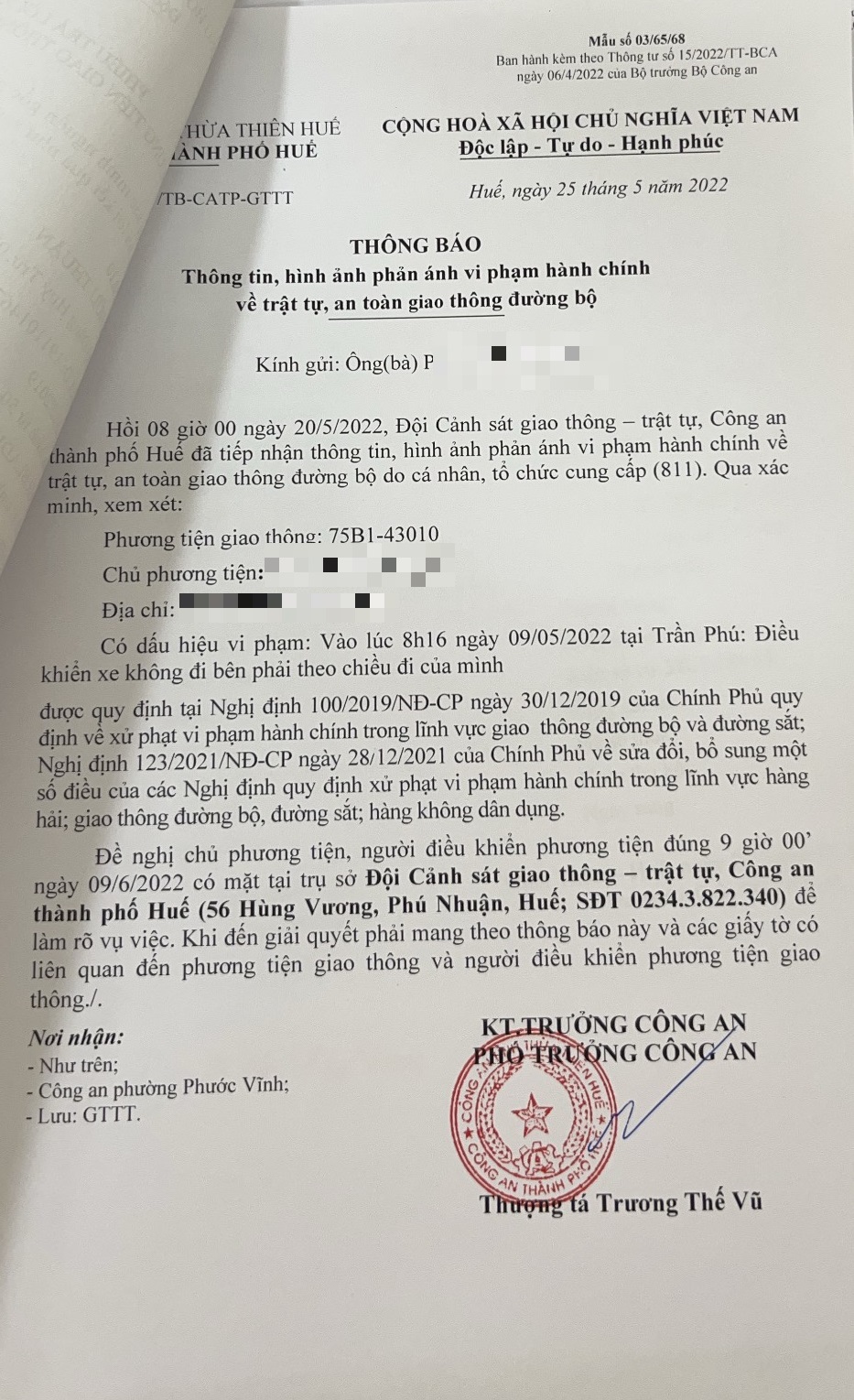 Công an thành phố đã lập hồ sơ, thông báo chủ phương tiện đến làm việc vào ngày 09/6/2022. Tuy nhiên, hiện chủ phương tiện vẫn chưa trình diện tại cơ quan. Công an thành phố Huế sẽ tiếp tục thông báo lực lượng tuần tra trên địa bàn, trong quá trình làm nhiệm vụ phát hiện, xử lý.