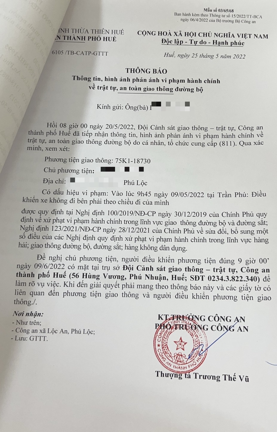 Công an thành phố đã lập hồ sơ, thông báo chủ phương tiện đến làm việc vào ngày 09/6/2022. Tuy nhiên, hiện chủ phương tiện vẫn chưa trình diện tại cơ quan. Công an thành phố Huế sẽ tiếp tục thông báo lực lượng tuần tra trên địa bàn, trong quá trình làm nhiệm vụ phát hiện, xử lý.