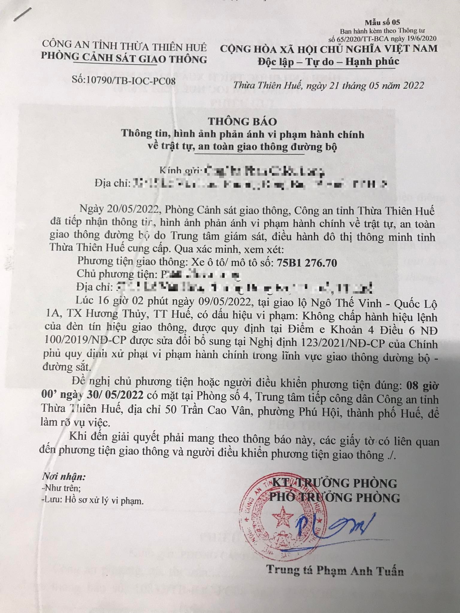 Vào lúc 16 giờ 02 phút ngày 09/05/2022, mô tô mang biển kiểm soát 75B127670 không chấp hành hiệu lệnh của đèn tín hiệu giao thông tại giao lộ Quốc Lộ 1A - Ngô Thế Vinh.
