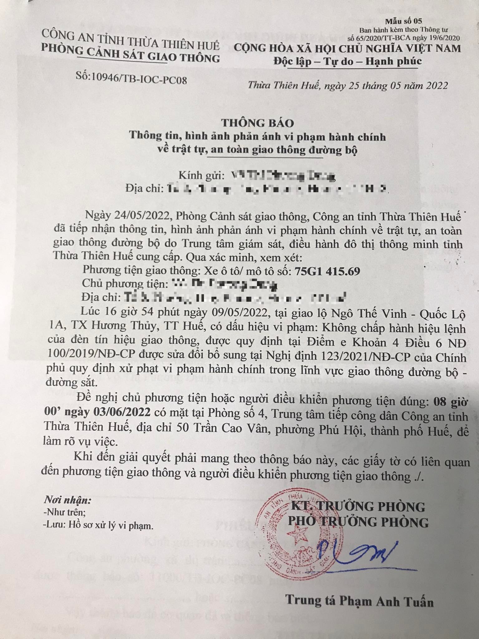 Vào lúc 16 giờ 54 phút ngày 09/05/2022, mô tô mang biển kiểm soát 75G141569 không chấp hành hiệu lệnh của đèn tín hiệu giao thông tại giao lộ Quốc Lộ 1A - Ngô Thế Vinh.