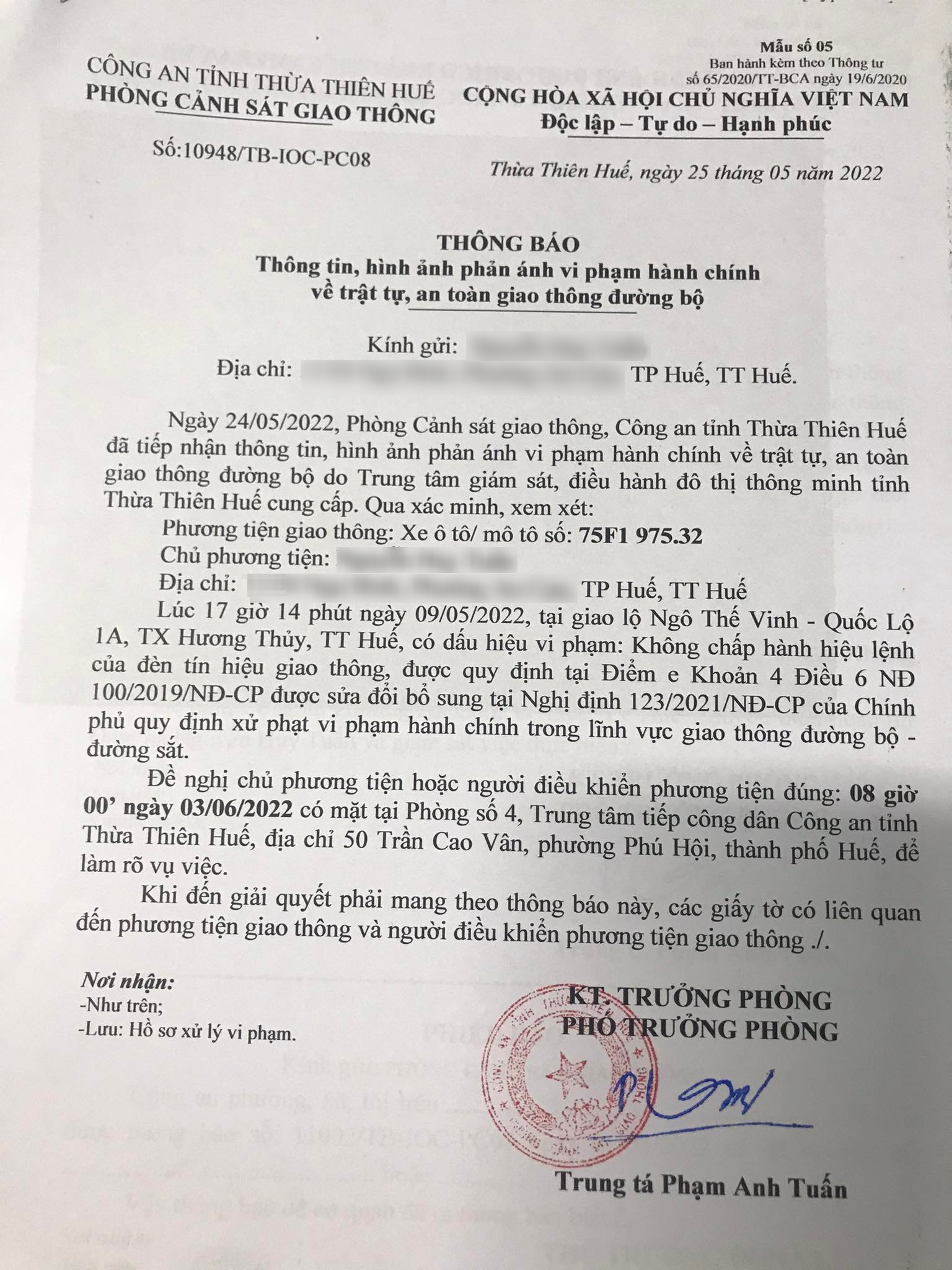 Không chấp hành hiệu lệnh của đèn tín hiệu giao thông, quy định tại điểm e khoản 4 điều 6 Nghị định 100/2019/NĐ-CP được sửa đổi, bổ sung tại Nghị định 123/NĐ-CP ngày 28/12/2021. Phòng Cảnh sát giao thông đã gửi thông báo yêu cầu chủ phương tiện đến làm việc. Tuy nhiên, đến nay chủ phương tiện vẫn chưa đến làm việc theo yêu cầu. Phòng Cảnh sát giao thông sẽ tiếp tục gửi thông báo đến Công an xã/ phường/ thị trấn (nơi thường trú của chủ phương tiện). Đồng thời, thông báo cho lực lượng tuần tra kiểm soát trên đường phát hiện, xử lý.