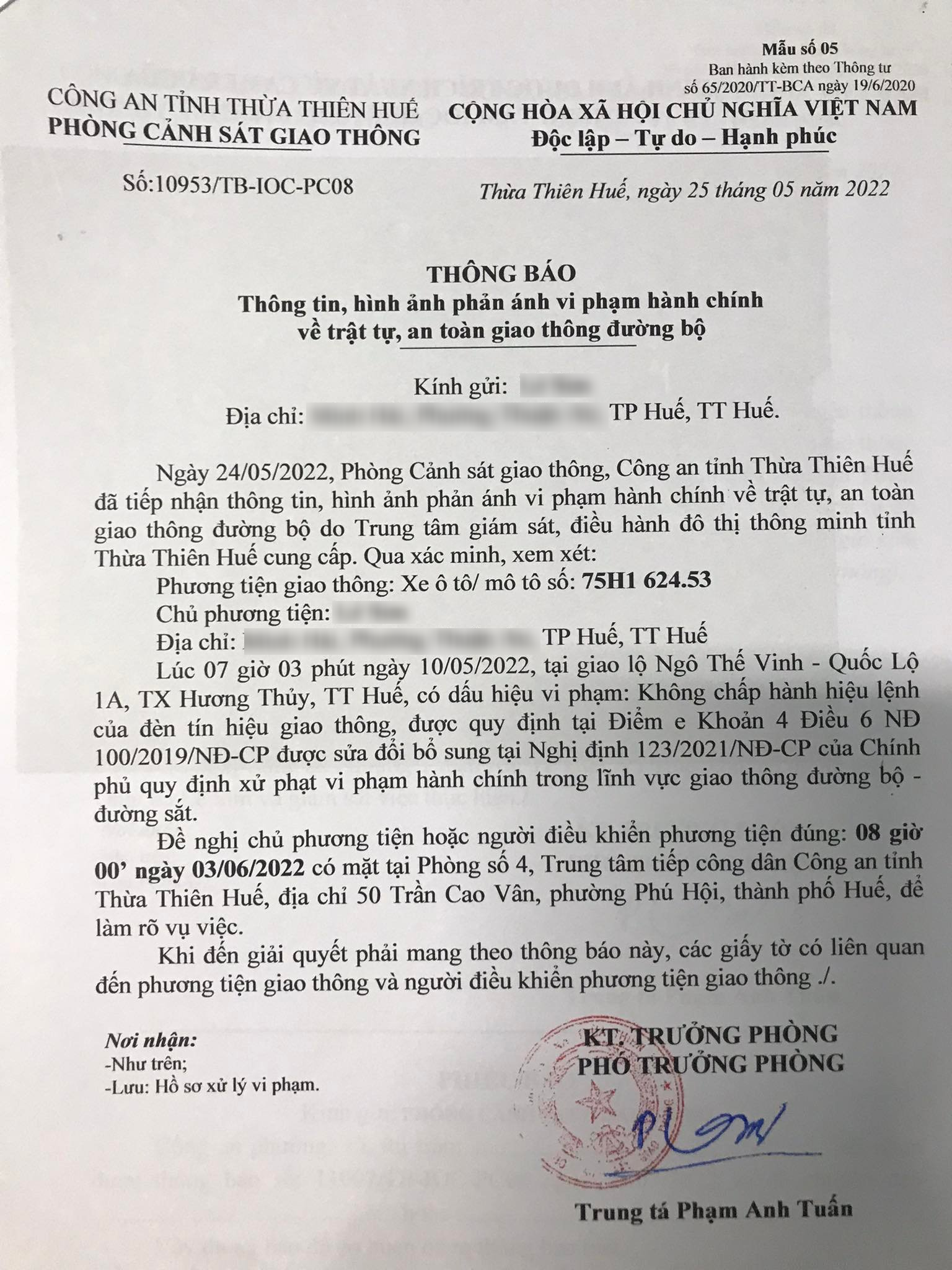 Phòng Cảnh sát giao thông xác định lỗi vi phạm của người điều khiển phương tiện 75H162453: Không chấp hành hiệu lệnh của đèn tín hiệu giao thông, quy định tại điểm e khoản 4 điều 6 Nghị định 100/2019/NĐ-CP được sửa đổi, bổ sung tại Nghị định 123/NĐ-CP ngày 28/12/2021.