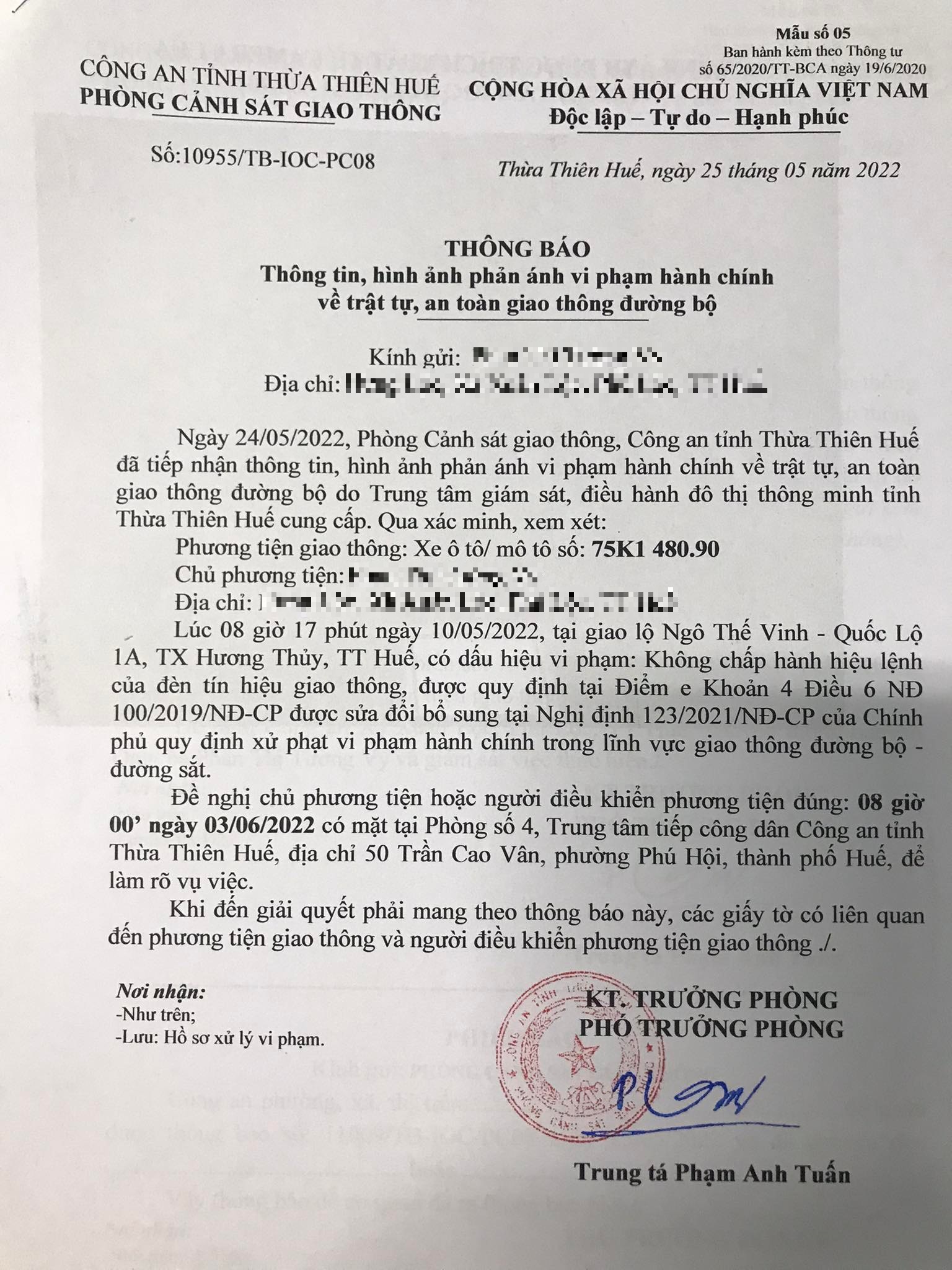 Vào lúc 08 giờ 17 phút ngày 10/05/2022, mô tô mang biển kiểm soát 75K148090 không chấp hành hiệu lệnh của đèn tín hiệu giao thông tại giao lộ Quốc Lộ 1A - Ngô Thế Vinh.