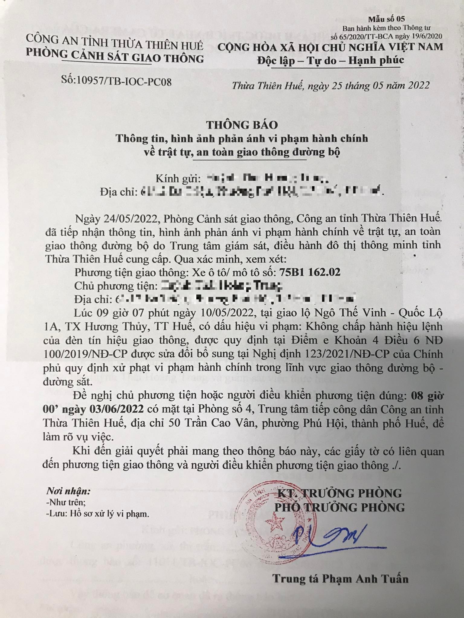Vào lúc 09 giờ 07 phút ngày 10/05/2022, mô tô mang biển kiểm soát 75B116202 không chấp hành hiệu lệnh của đèn tín hiệu giao thông tại giao lộ Quốc Lộ 1A - Ngô Thế Vinh.