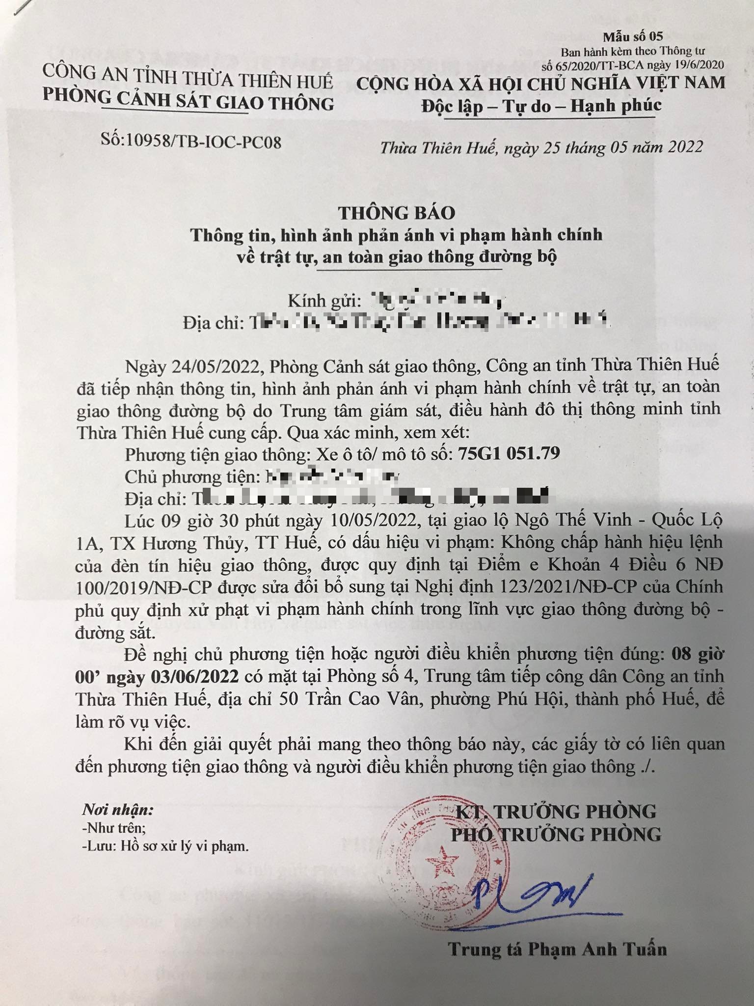 Vào lúc 09 giờ 30 phút ngày 10/05/2022, mô tô mang biển kiểm soát 75G105179 không chấp hành hiệu lệnh của đèn tín hiệu giao thông tại giao lộ Quốc Lộ 1A - Ngô Thế Vinh.