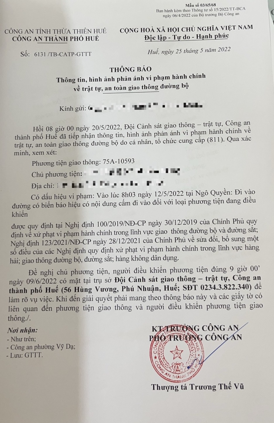 Công an thành phố đã lập hồ sơ, thông báo chủ phương tiện đến làm việc vào ngày 09/6/2022. Tuy nhiên, hiện chủ phương tiện vẫn chưa trình diện tại cơ quan. Công an thành phố sẽ gửi thông báo cho cơ quan đăng kiểm để đưa phương tiện vào cảnh báo trên Chương trình Quản lý kiểm định.