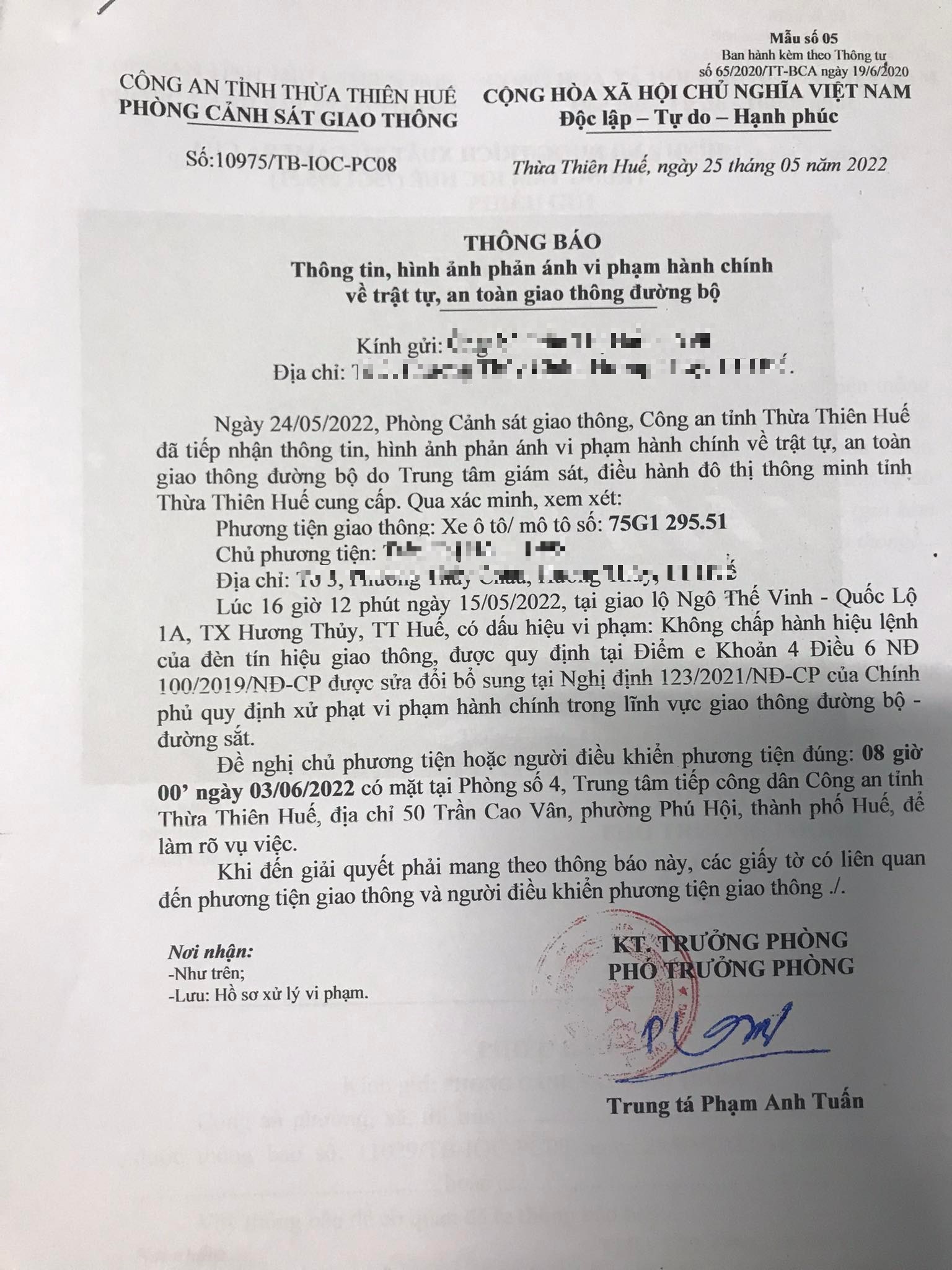 Vào lúc 16 giờ 12 phút ngày 15/05/2022, mô tô mang biển kiểm soát 75G129551 không chấp hành hiệu lệnh của đèn tín hiệu giao thông tại giao lộ Quốc Lộ 1A - Ngô Thế Vinh.