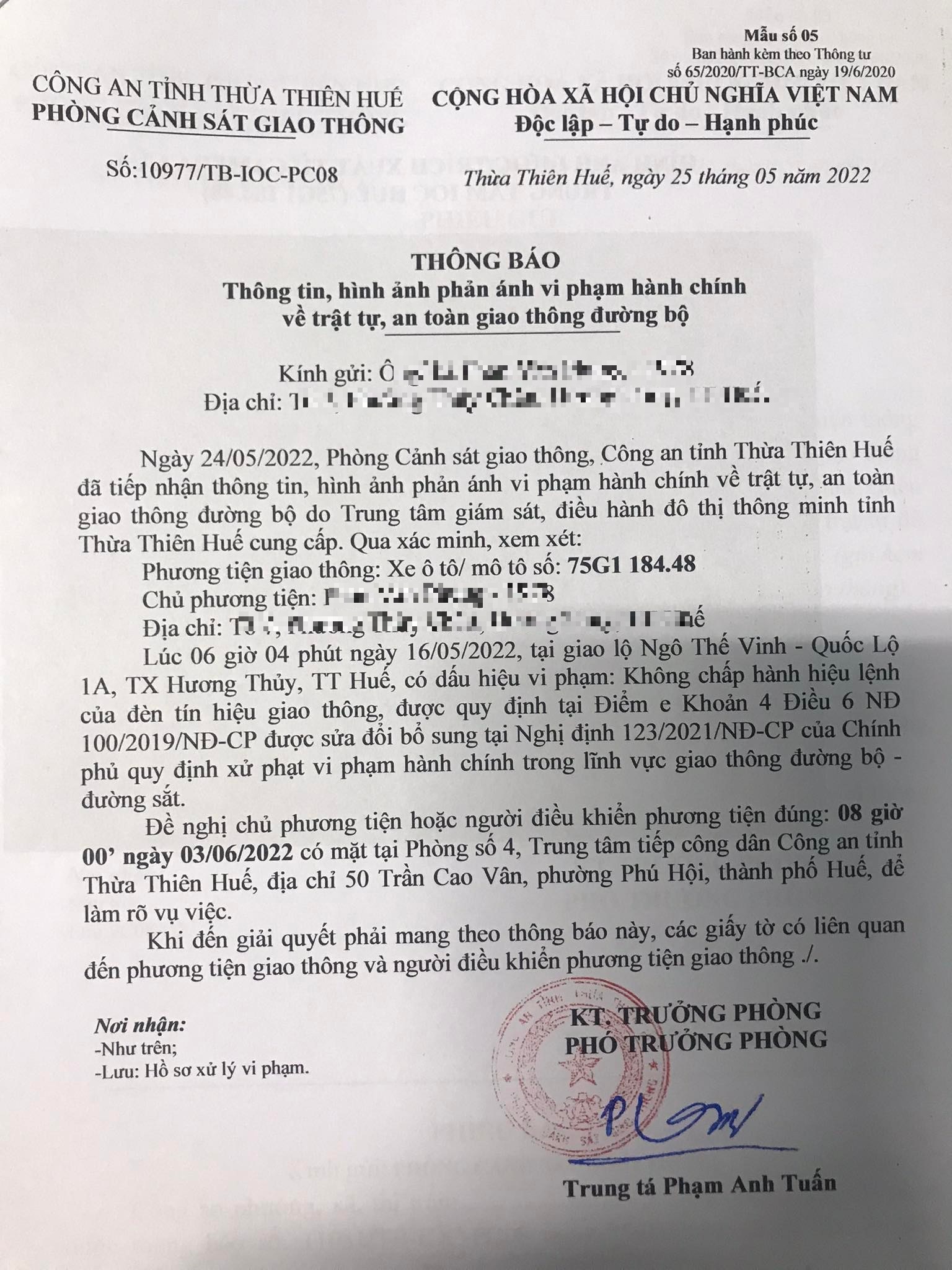 Vào lúc 06 giờ 04 phút ngày 16/05/2022, mô tô mang biển kiểm soát 75G118448 không chấp hành hiệu lệnh của đèn tín hiệu giao thông tại giao lộ Quốc Lộ 1A - Ngô Thế Vinh.