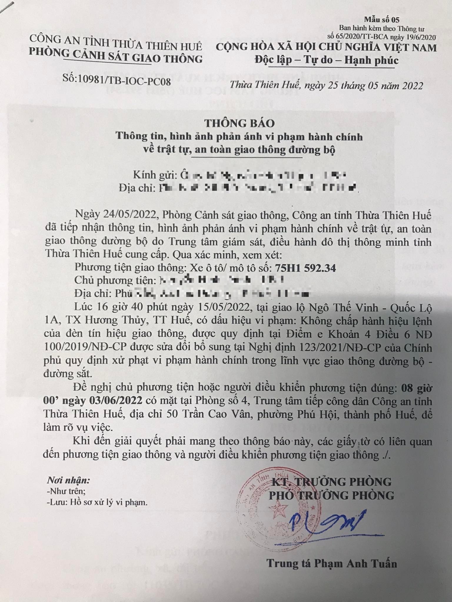 Vào lúc 16 giờ 40 phút ngày 15/05/2022, mô tô mang biển kiểm soát 75H159234 không chấp hành hiệu lệnh của đèn tín hiệu giao thông tại giao lộ Quốc Lộ 1A - Ngô Thế Vinh.