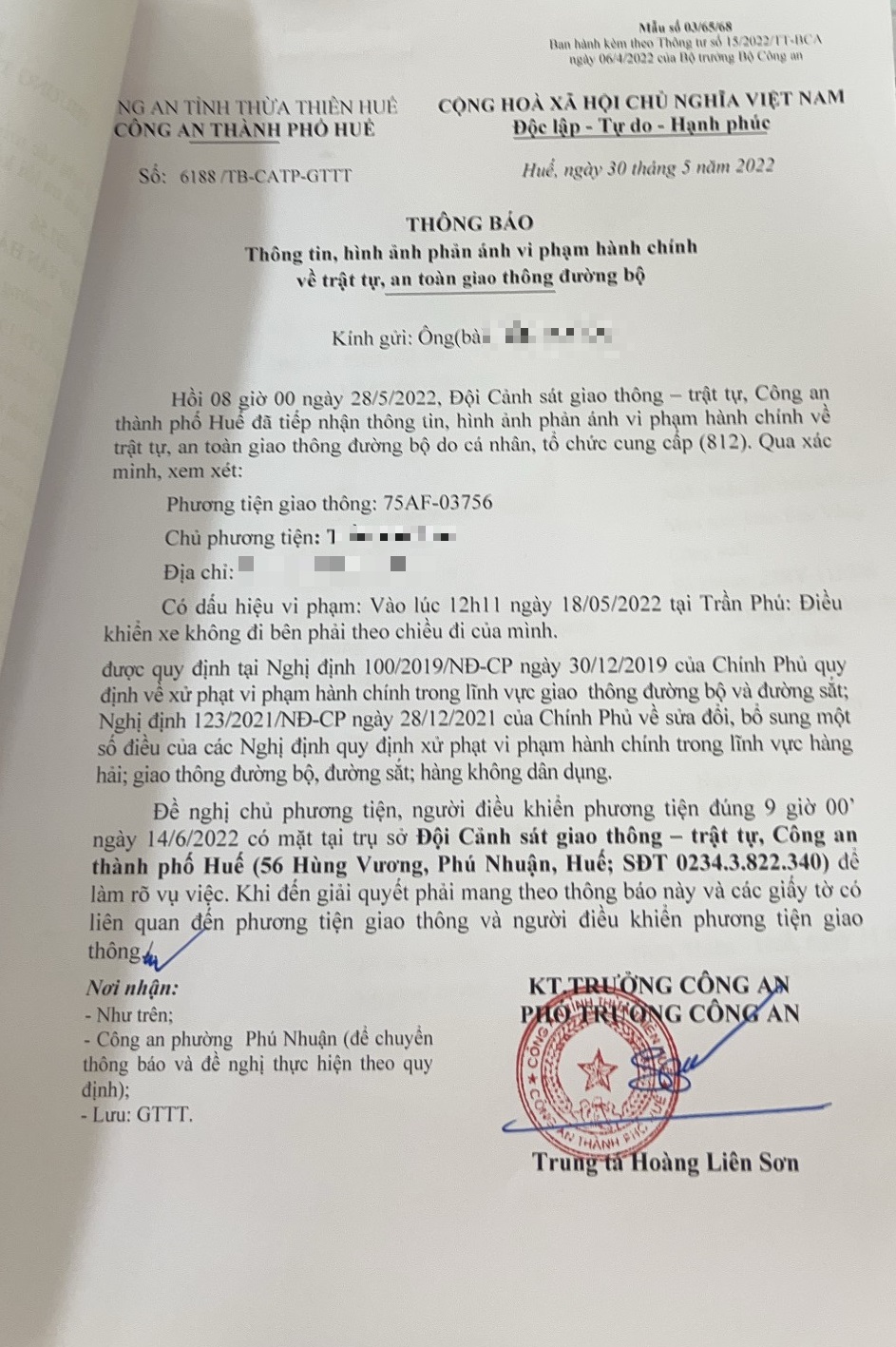 Công an thành phố đã lập hồ sơ, thông báo chủ phương tiện đến làm việc vào ngày 14/6/2022. Tuy nhiên, hiện chủ phương tiện vẫn chưa trình diện tại cơ quan. Công an thành phố Huế sẽ tiếp tục thông báo lực lượng tuần tra trên địa bàn, trong quá trình làm nhiệm vụ phát hiện, xử lý.