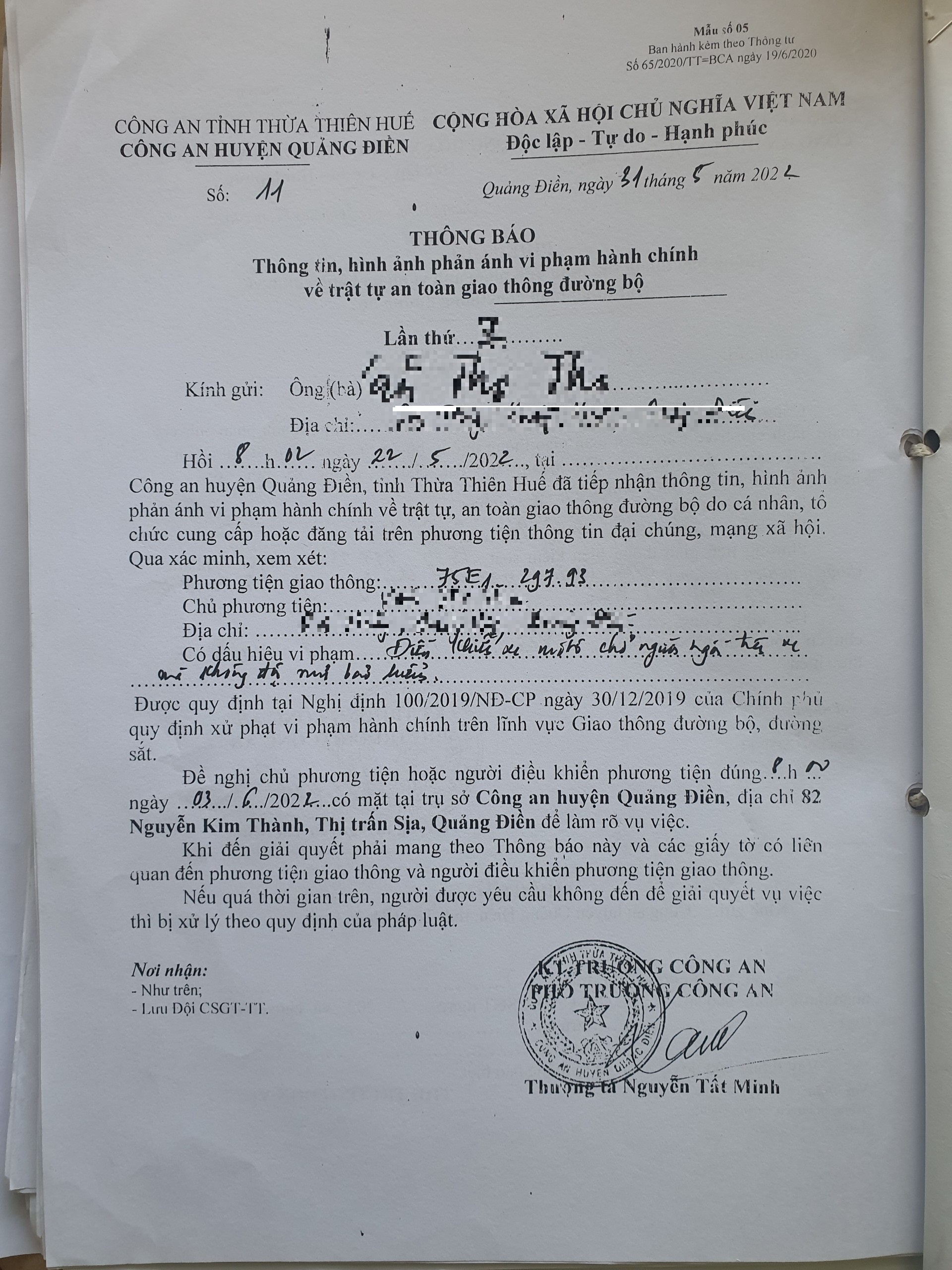 Công an huyện Quảng Điền đã lập hồ sơ, thông báo chủ phương tiện đến làm việc. Tuy nhiên, hiện chủ phương tiện vẫn chưa trình diện tại cơ quan. Công anh huyện Quảng Điền sẽ tiếp tục thông báo lực lượng tuần tra trên địa bàn, trong quá trình làm nhiệm vụ phát hiện, xử lý.