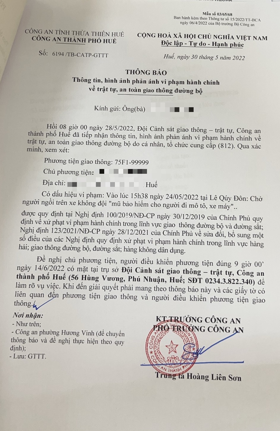 Công an thành phố đã lập hồ sơ, thông báo chủ phương tiện đến làm việc vào ngày 14/6/2022. Tuy nhiên, hiện chủ phương tiện vẫn chưa trình diện tại cơ quan. Công an thành phố Huế sẽ tiếp tục thông báo lực lượng tuần tra trên địa bàn, trong quá trình làm nhiệm vụ phát hiện, xử lý.