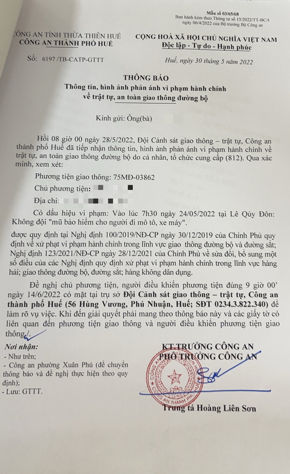 Công an thành phố đã lập hồ sơ, thông báo chủ phương tiện đến làm việc vào ngày 14/6/2022. Tuy nhiên, hiện chủ phương tiện vẫn chưa trình diện tại cơ quan. Công an thành phố Huế sẽ tiếp tục thông báo lực lượng tuần tra trên địa bàn, trong quá trình làm nhiệm vụ phát hiện, xử lý.