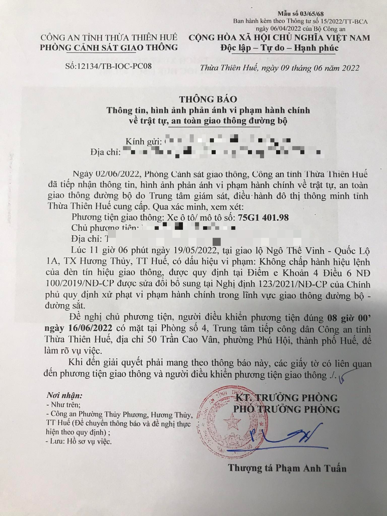 Vào lúc 11 giờ 06 phút ngày 19/05/2022, mô tô mang biển kiểm soát 75G140198 không chấp hành hiệu lệnh của đèn tín hiệu giao thông tại giao lộ Quốc Lộ 1A - Ngô Thế Vinh.