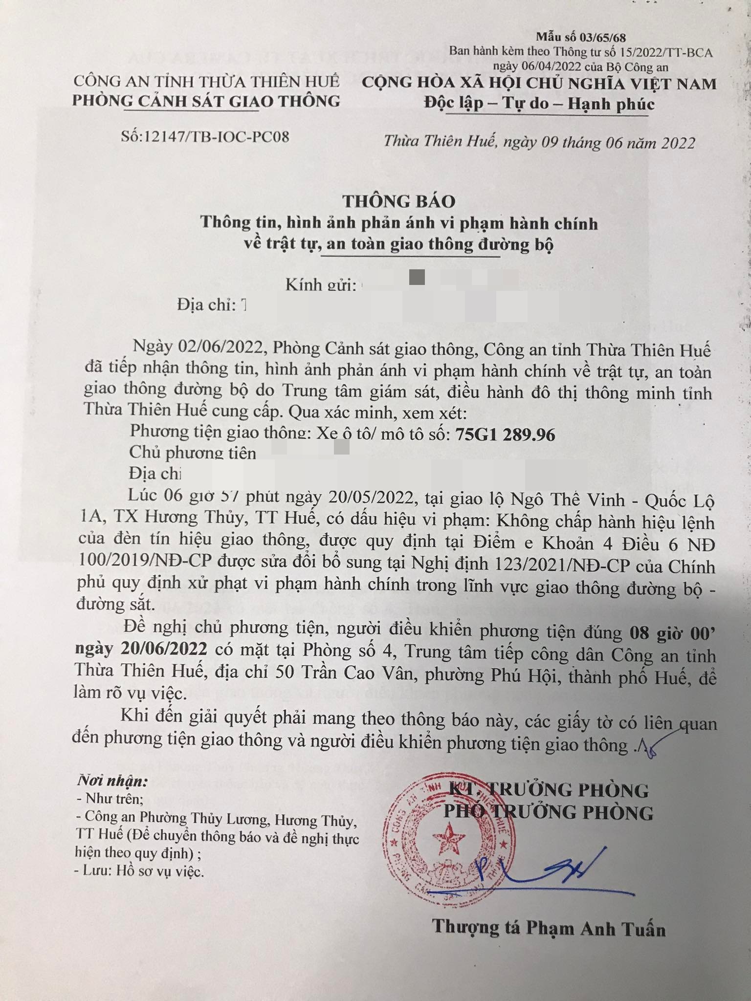 Vào lúc 06 giờ 57 phút ngày 20/05/2022, mô tô mang biển kiểm soát 75G128996 không chấp hành hiệu lệnh của đèn tín hiệu giao thông tại giao lộ Quốc Lộ 1A - Ngô Thế Vinh.