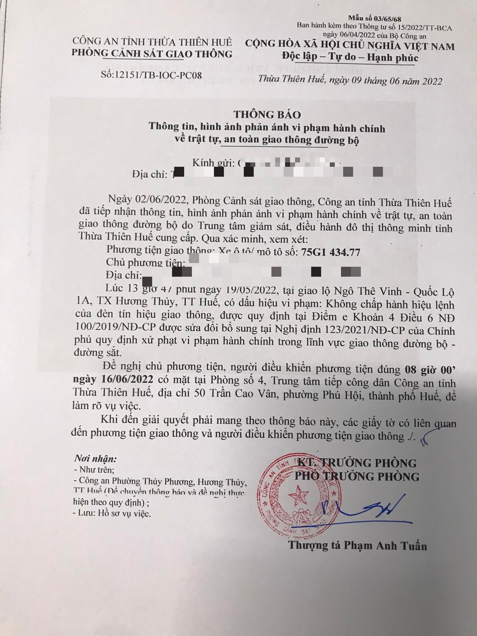 Vào lúc 13 giờ 47 phút ngày 19/05/2022, mô tô mang biển kiểm soát 75G143477 không chấp hành hiệu lệnh của đèn tín hiệu giao thông tại giao lộ Quốc Lộ 1A - Ngô Thế Vinh.