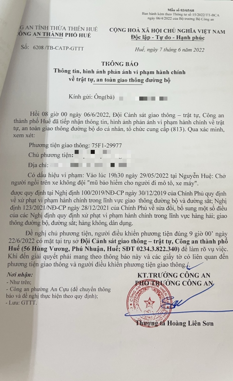 Công an thành phố đã lập hồ sơ, thông báo chủ phương tiện đến làm việc vào ngày 22/6/2022. Tuy nhiên, hiện chủ phương tiện vẫn chưa trình diện tại cơ quan. Công an thành phố Huế sẽ tiếp tục thông báo lực lượng tuần tra trên địa bàn, trong quá trình làm nhiệm vụ phát hiện, xử lý.
