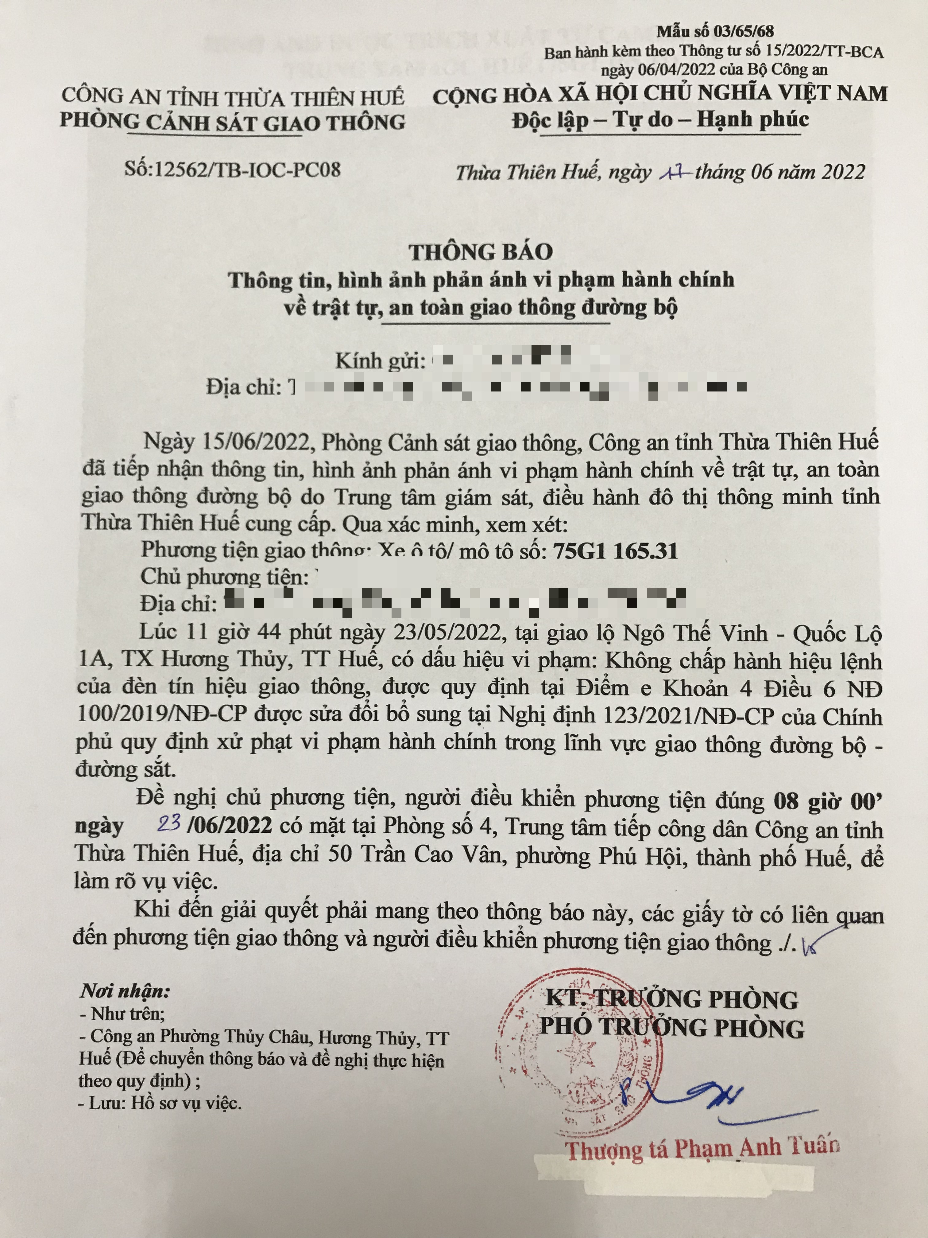 Vào lúc 11 giờ 44 phút ngày 23/05/2022, mô tô mang biển kiểm soát 75G116531 không chấp hành hiệu lệnh của đèn tín hiệu giao thông tại giao lộ Quốc Lộ 1A - Ngô Thế Vinh.