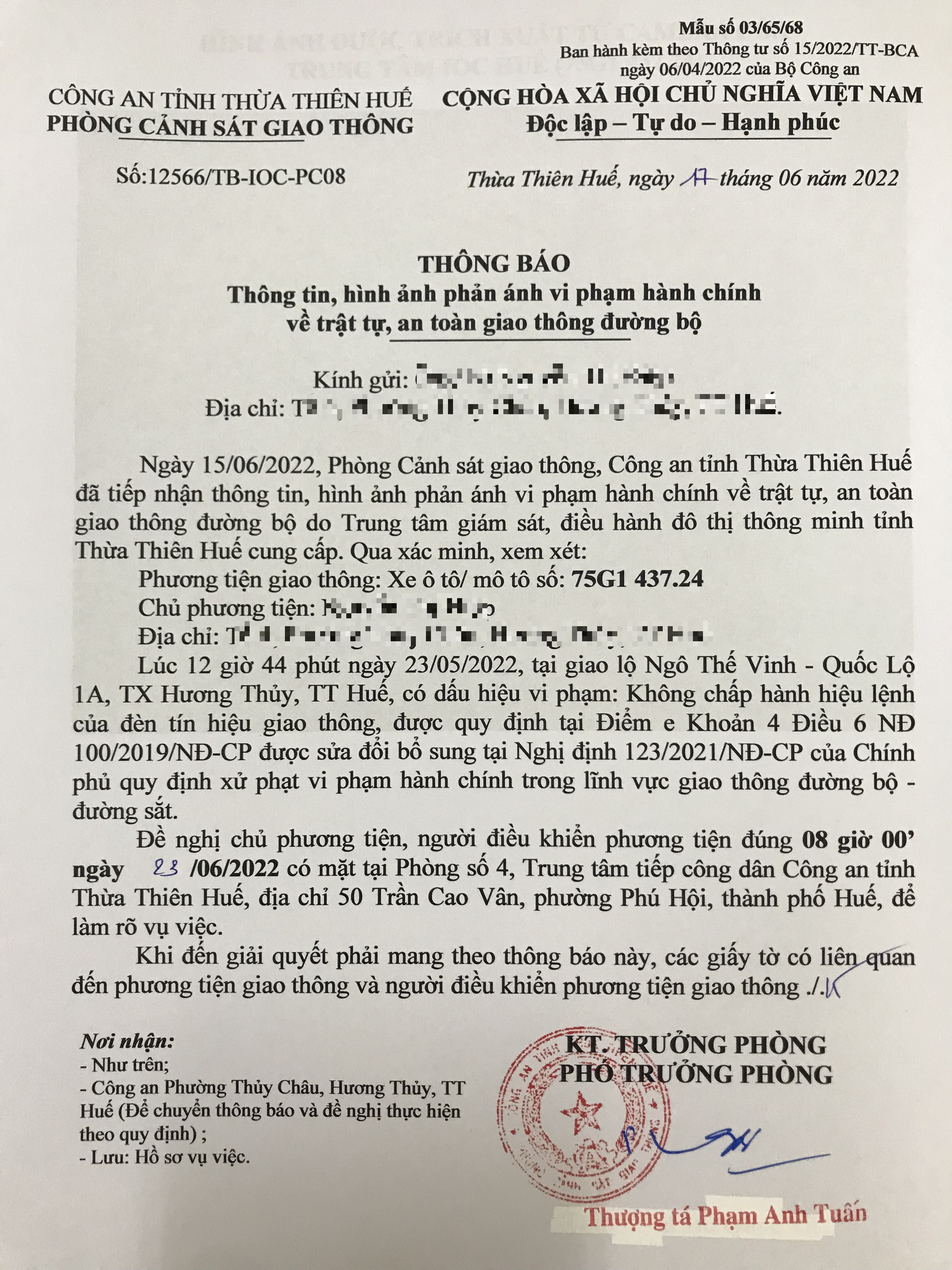 Vào lúc 12 giờ 44 phút ngày 23/05/2022, mô tô mang biển kiểm soát 75G143724 không chấp hành hiệu lệnh của đèn tín hiệu giao thông tại giao lộ Quốc Lộ 1A - Ngô Thế Vinh.