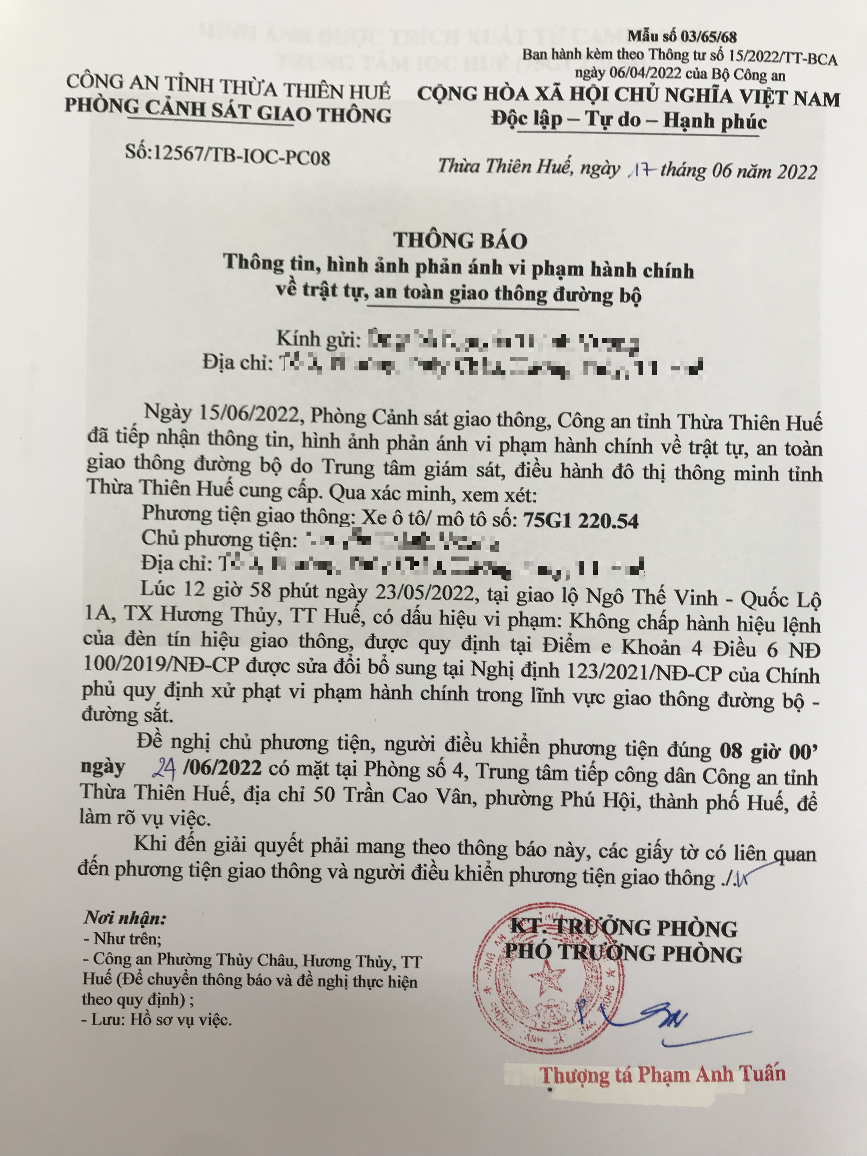 Vào lúc 12 giờ 58 phút ngày 23/05/2022, mô tô mang biển kiểm soát 75G122054 không chấp hành hiệu lệnh của đèn tín hiệu giao thông tại giao lộ Quốc Lộ 1A - Ngô Thế Vinh.