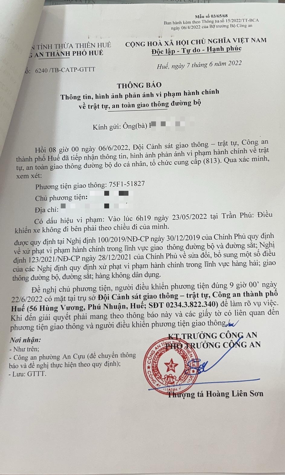 Công an thành phố đã lập hồ sơ, thông báo chủ phương tiện đến làm việc vào ngày 22/6/2022. Tuy nhiên, hiện chủ phương tiện vẫn chưa trình diện tại cơ quan. Công an thành phố Huế sẽ tiếp tục thông báo lực lượng tuần tra trên địa bàn, trong quá trình làm nhiệm vụ phát hiện, xử lý.