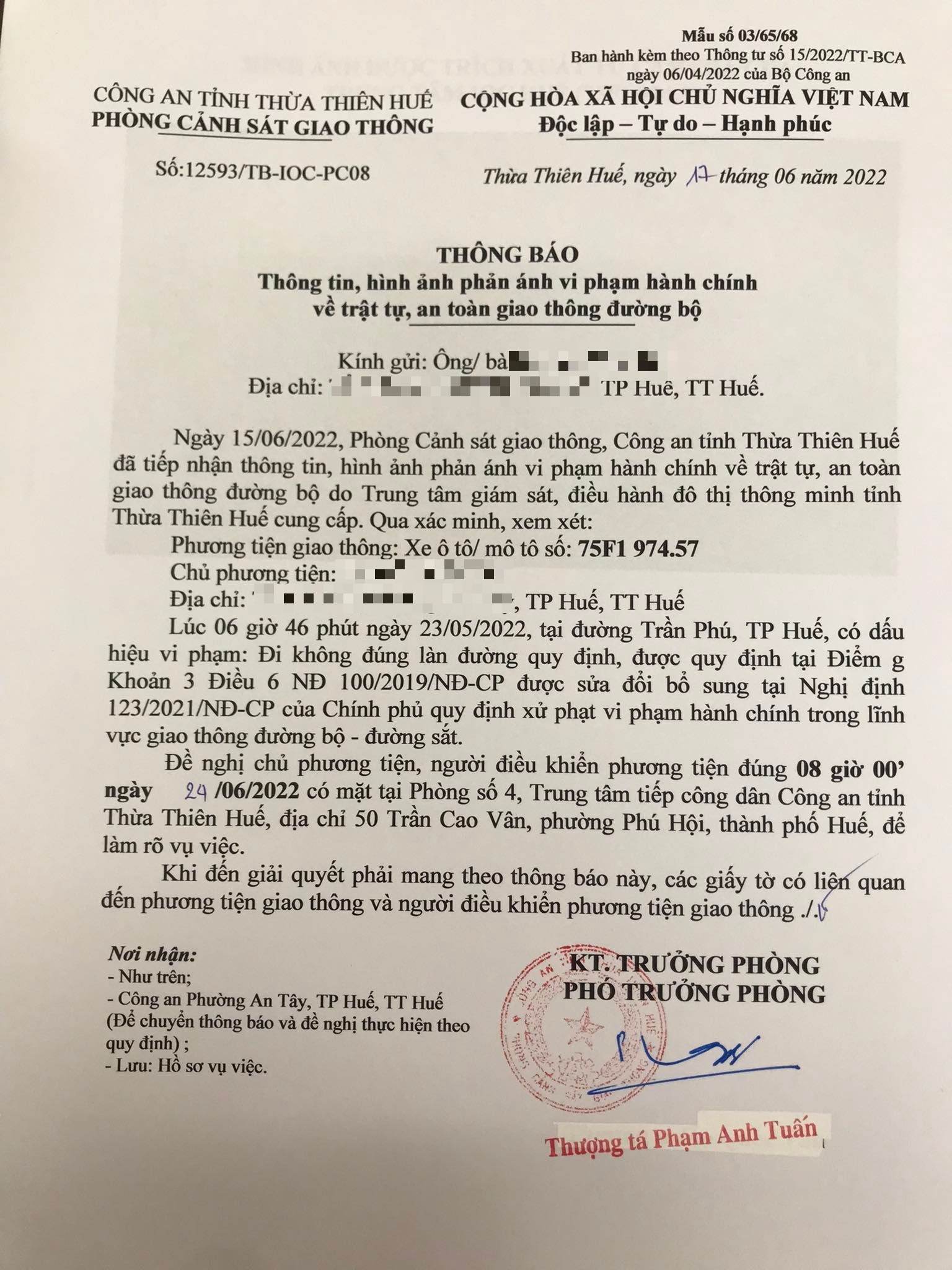 Phòng Cảnh sát giao thông đã gửi thông báo, yêu cầu chủ phương tiện đến làm việc vào ngày 24/6/2022. Tuy nhiên, hiện chủ phương tiện vẫn chưa trình diện tại cơ quan.Phòng Cảnh sát giao thông sẽ tiếp tục thông báo Công an địa phương nơi chủ phương tiện thường trú; đồng thời, thông báo các tổ tuần tra kiểm soát trên địa bàn, trong quá trình làm nhiệm vụ nếu phát hiện sẽ tiến hành dừng xe để xử lý.