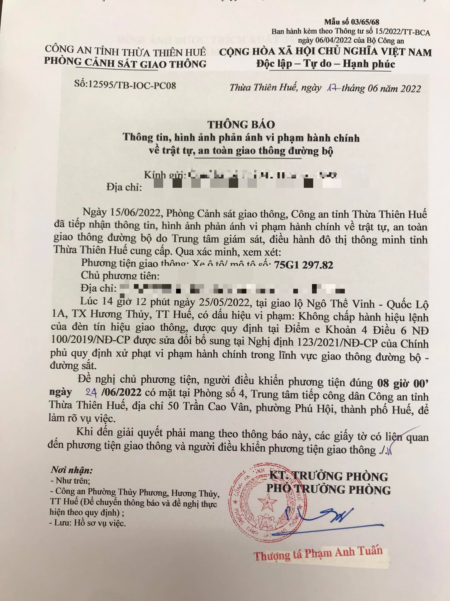 Vào lúc 14 giờ 12 phút ngày 25/05/2022, mô tô mang biển kiểm soát 75G129782 không chấp hành hiệu lệnh của đèn tín hiệu giao thông tại giao lộ Quốc Lộ 1A - Ngô Thế Vinh.
