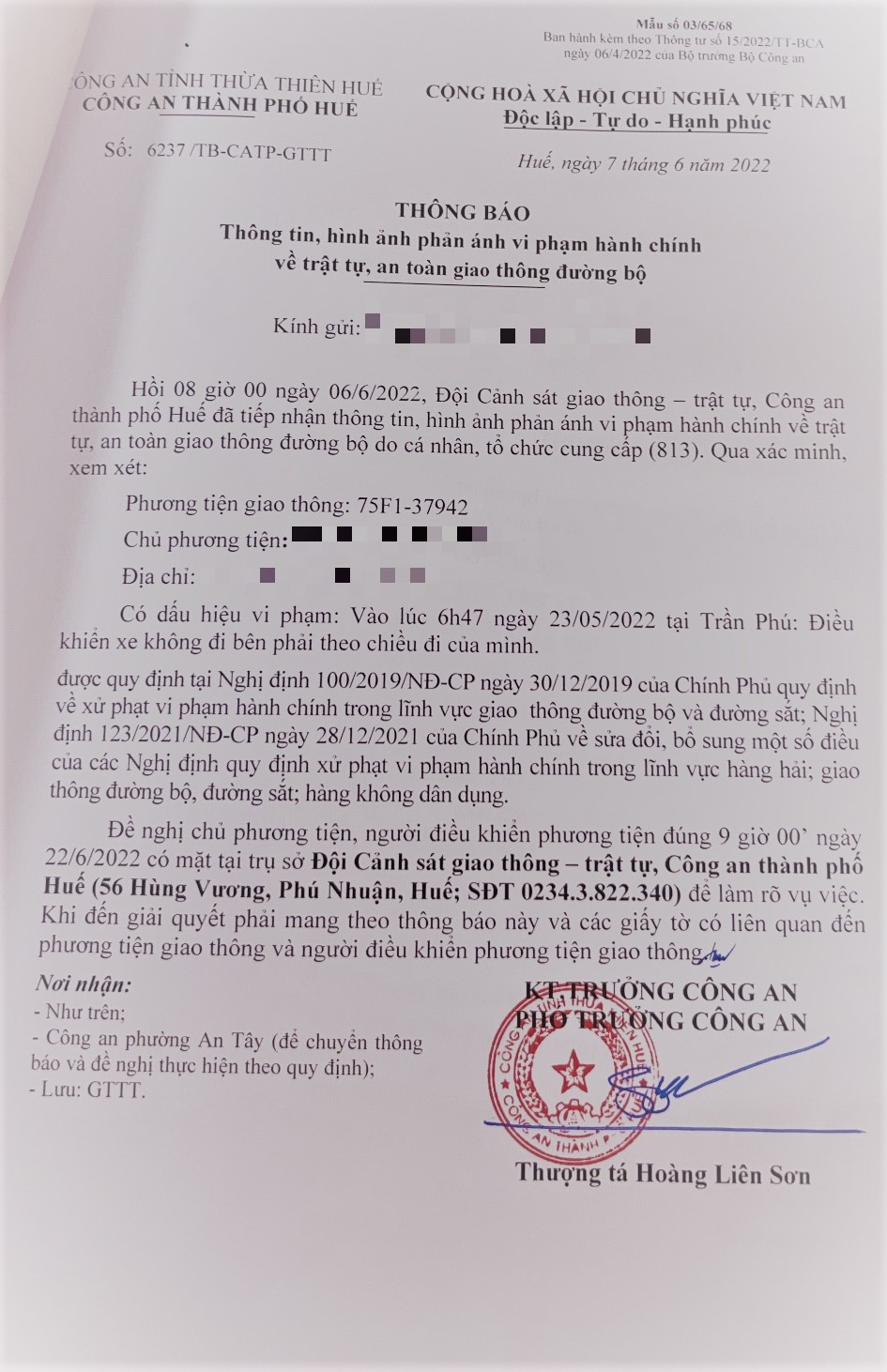 Công an thành phố đã lập hồ sơ, thông báo chủ phương tiện đến làm việc vào ngày 22/6/2022. Tuy nhiên, hiện chủ phương tiện vẫn chưa trình diện tại cơ quan. Công an thành phố Huế sẽ tiếp tục thông báo lực lượng tuần tra trên địa bàn, trong quá trình làm nhiệm vụ phát hiện, xử lý.