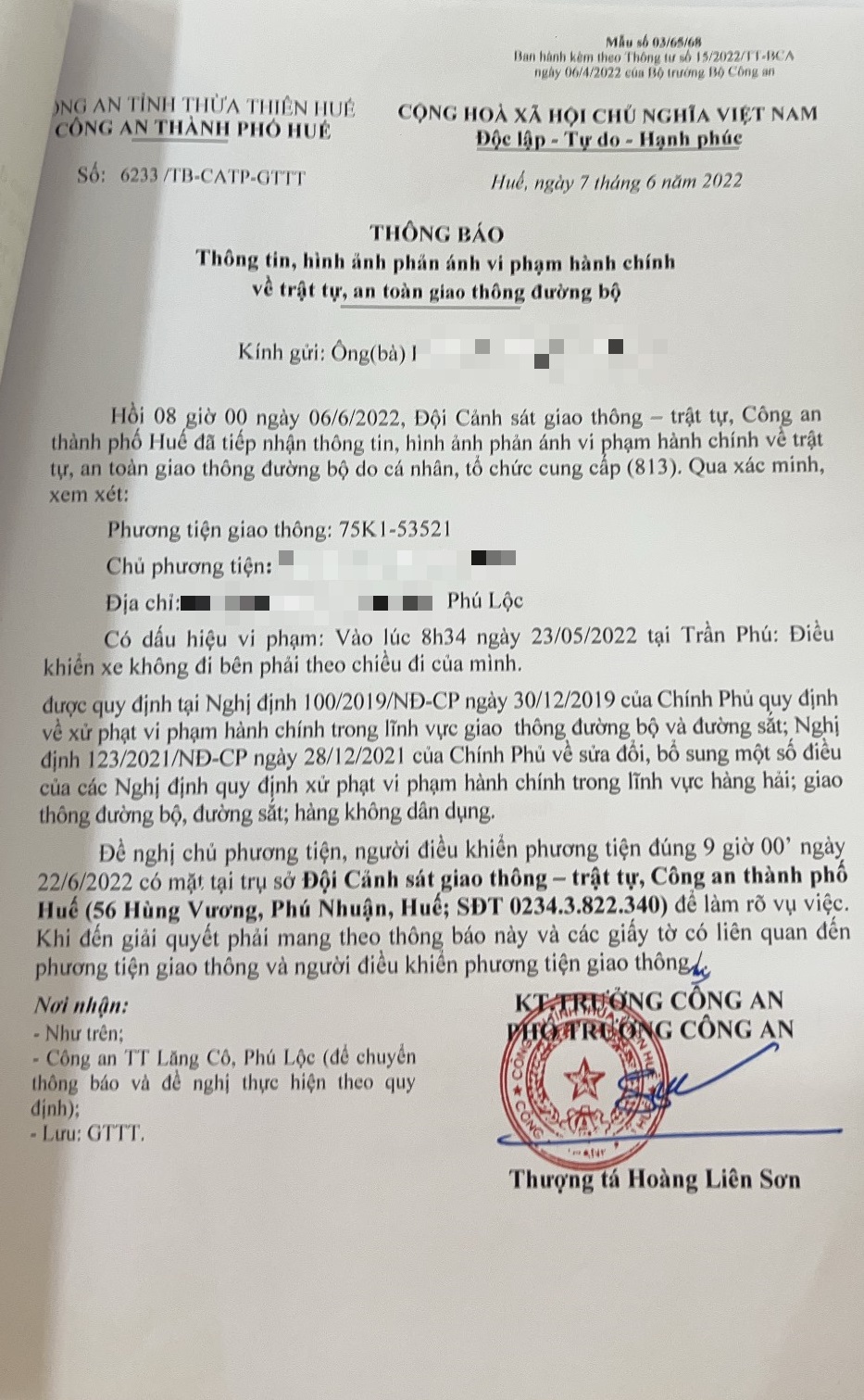 Công an thành phố đã lập hồ sơ, thông báo chủ phương tiện đến làm việc vào ngày 22/6/2022. Tuy nhiên, hiện chủ phương tiện vẫn chưa trình diện tại cơ quan. Công an thành phố Huế sẽ tiếp tục thông báo lực lượng tuần tra trên địa bàn, trong quá trình làm nhiệm vụ phát hiện, xử lý.