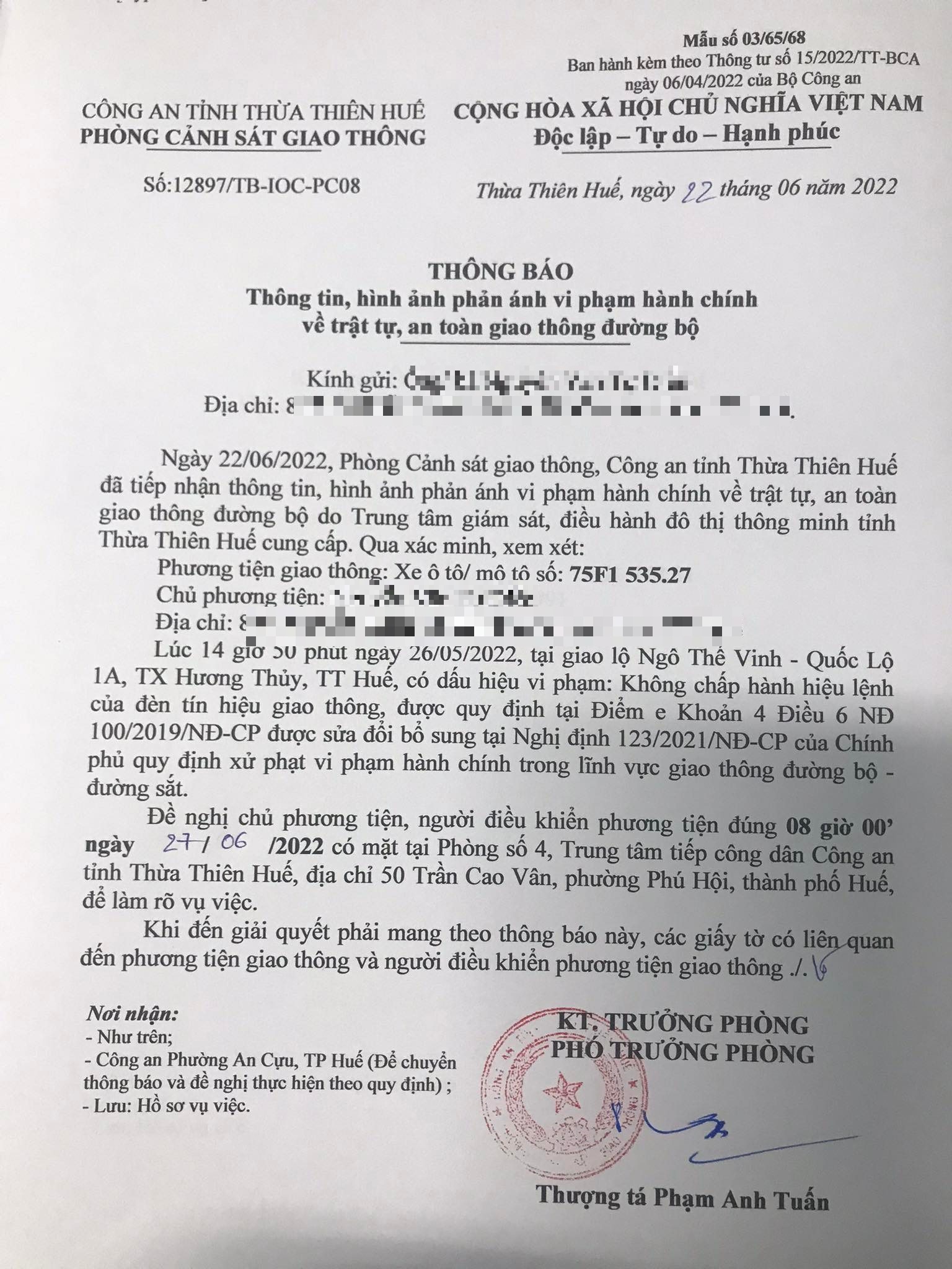 Vào lúc 14 giờ 50 phút ngày 26/05/2022, mô tô mang biển kiểm soát 75F153527 không chấp hành hiệu lệnh của đèn tín hiệu giao thông tại giao lộ Quốc Lộ 1A - Ngô Thế Vinh.