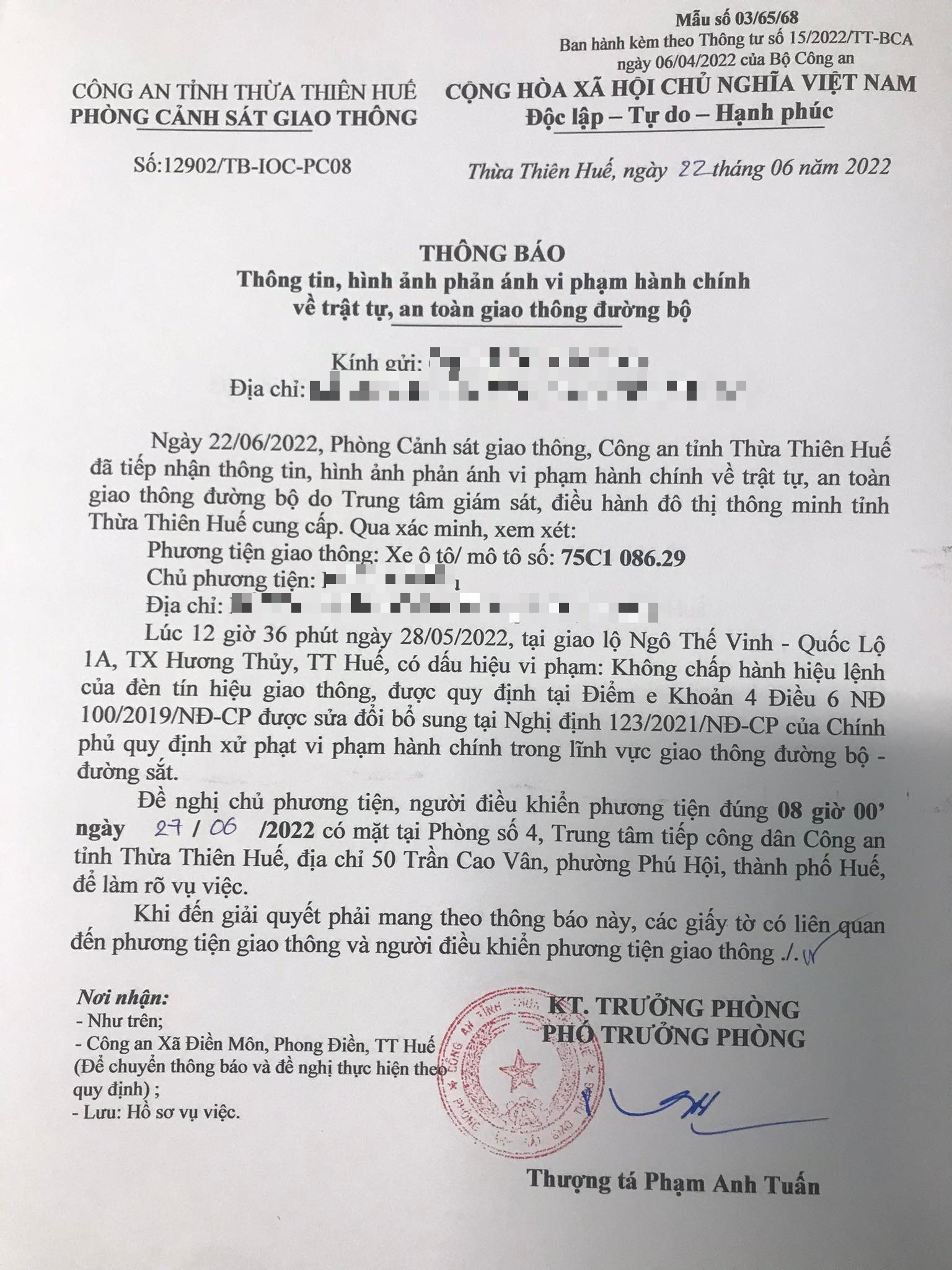 Vào lúc 12 giờ 36 phút ngày 28/05/2022, mô tô mang biển kiểm soát 75C108629 không chấp hành hiệu lệnh của đèn tín hiệu giao thông tại giao lộ Quốc Lộ 1A - Ngô Thế Vinh.