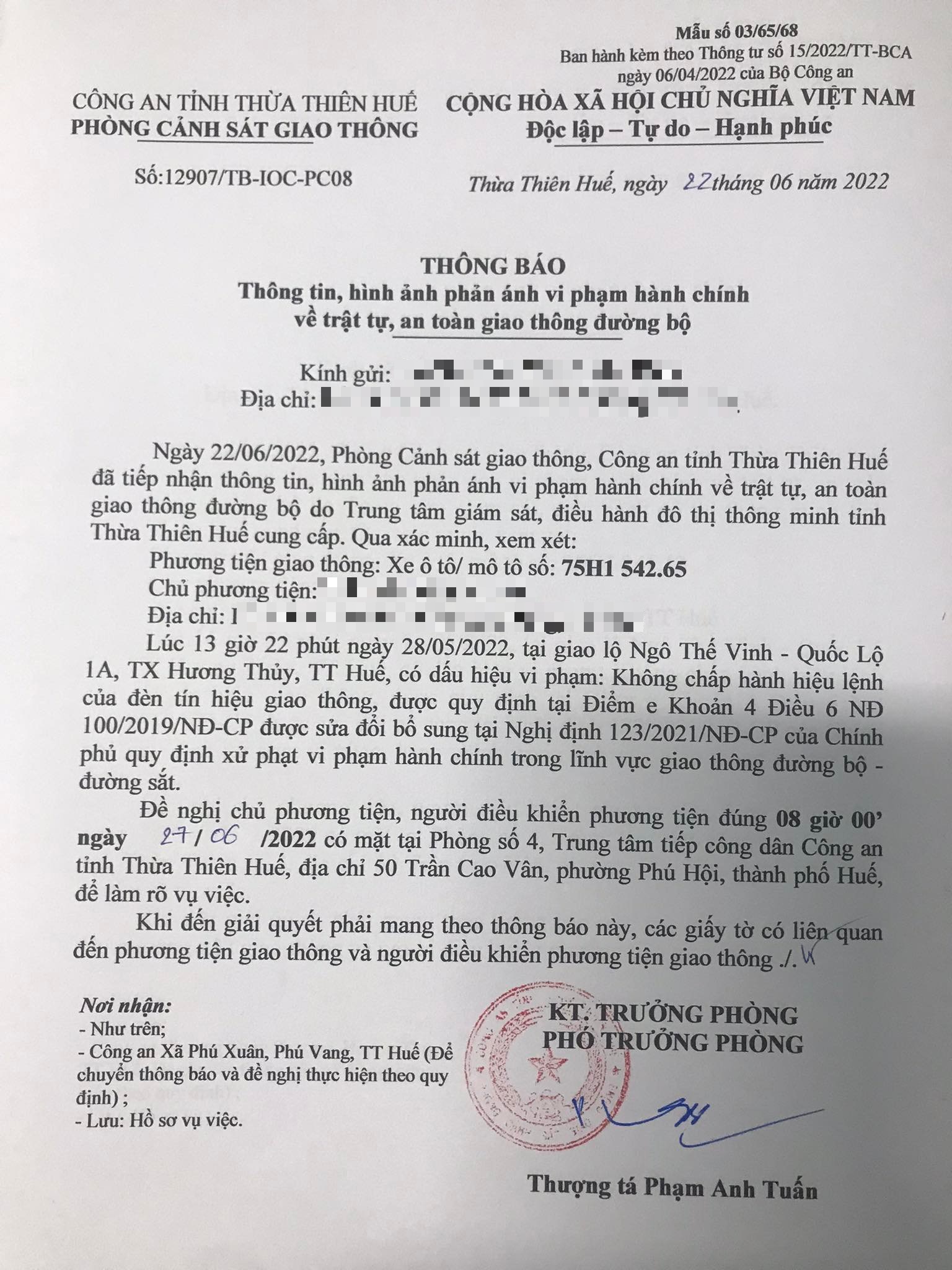 Vào lúc 13 giờ 22 phút ngày 28/05/2022, mô tô mang biển kiểm soát 75H154265 không chấp hành hiệu lệnh của đèn tín hiệu giao thông tại giao lộ Quốc Lộ 1A - Ngô Thế Vinh.