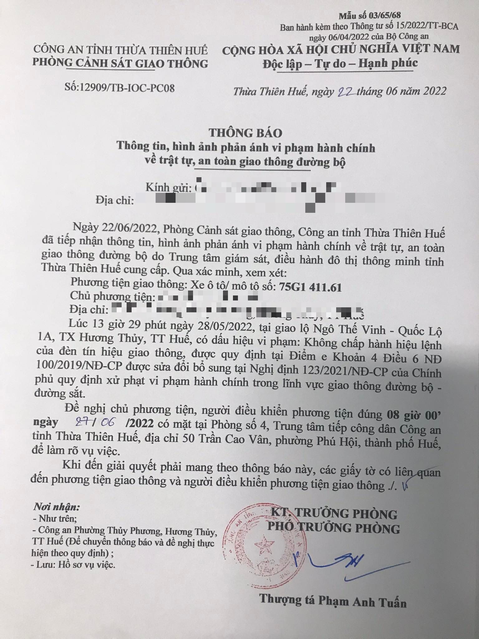 Vào lúc 13 giờ 29 phút ngày 28/05/2022, mô tô mang biển kiểm soát 75G141161 không chấp hành hiệu lệnh của đèn tín hiệu giao thông tại giao lộ Quốc Lộ 1A - Ngô Thế Vinh.