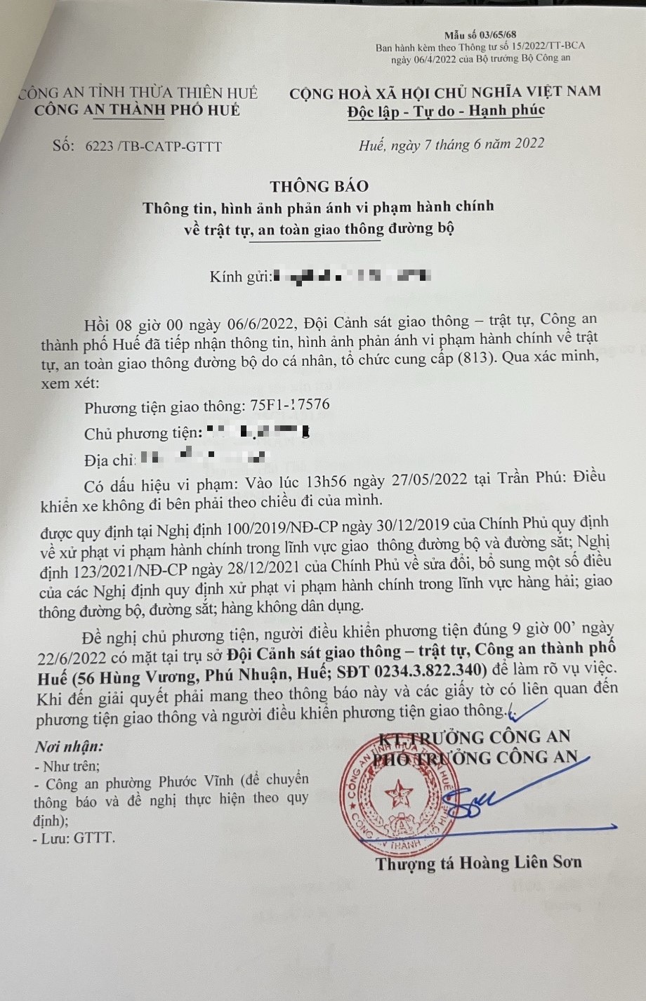 Công an thành phố đã lập hồ sơ, thông báo chủ phương tiện đến làm việc vào ngày 22/6/2022. Tuy nhiên, hiện chủ phương tiện vẫn chưa trình diện tại cơ quan. Công an thành phố Huế sẽ tiếp tục thông báo lực lượng tuần tra trên địa bàn, trong quá trình làm nhiệm vụ phát hiện, xử lý.